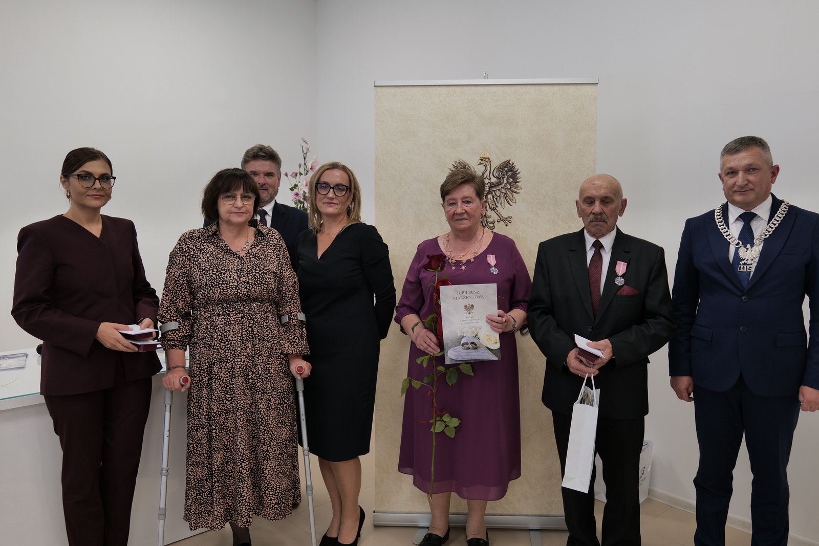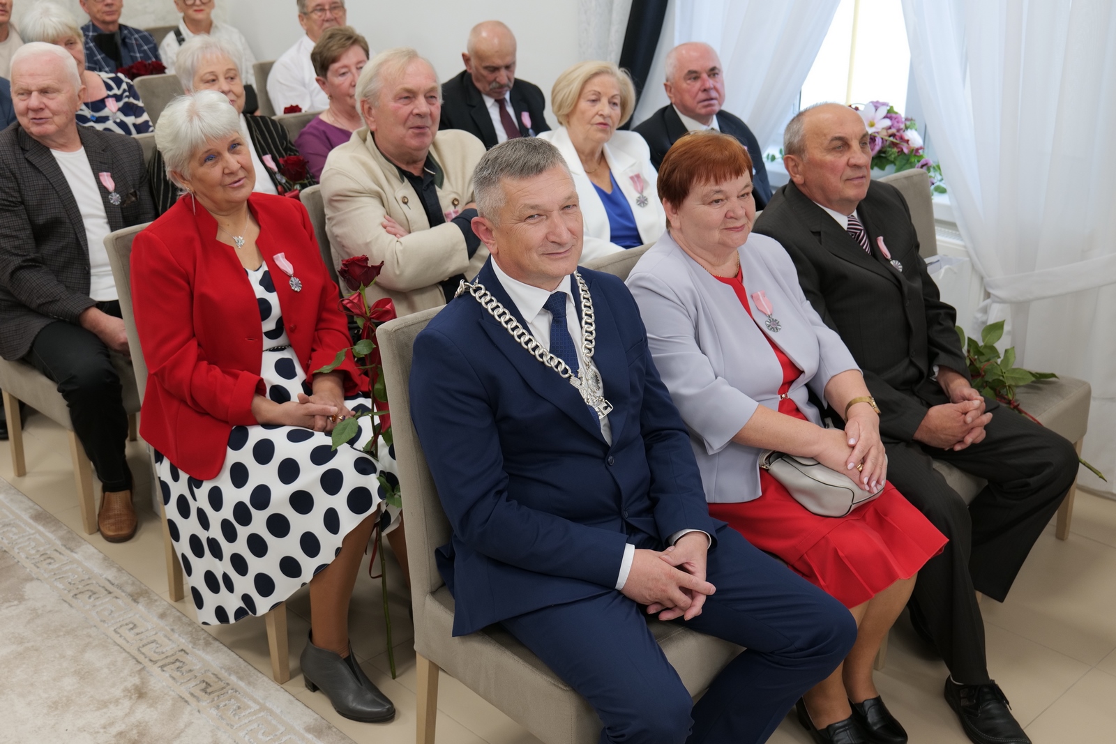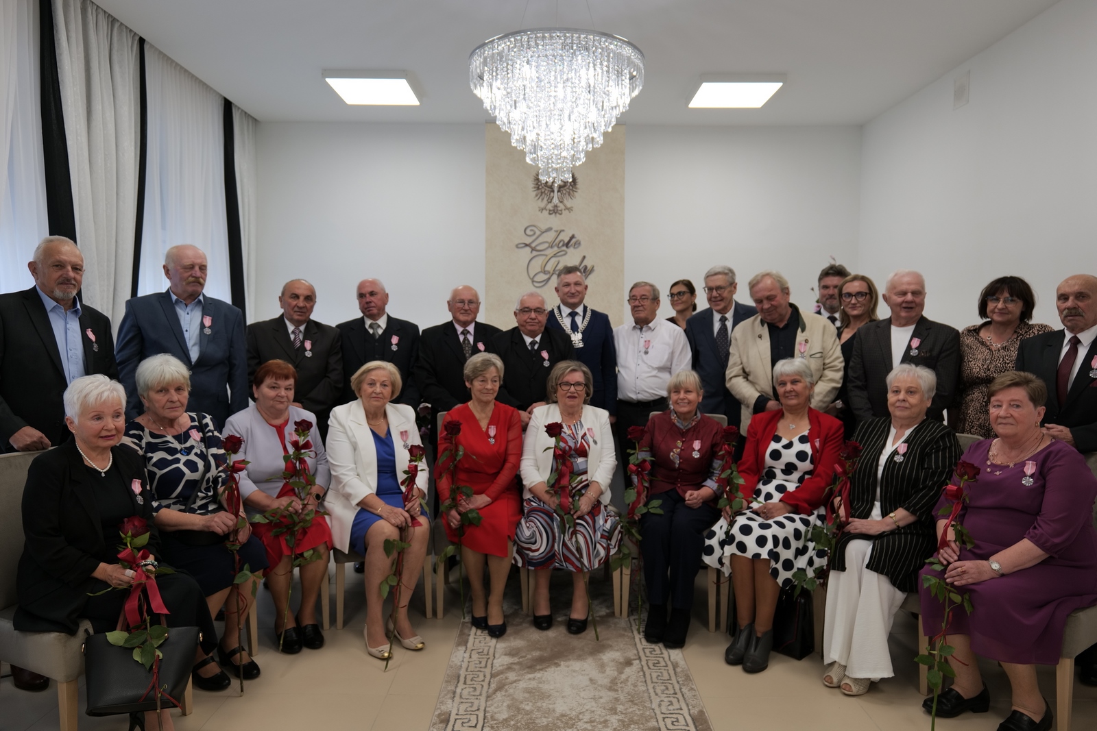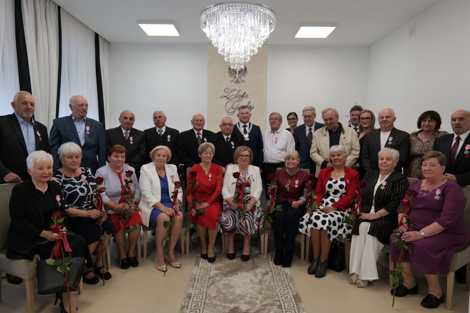 Szesnaście par małżeńskich z naszej gminy świętowało Jubileusz Złotych Godów. Piękna i wyjątkowa uroczystość odbyła się 3 października w Sali ślubów przy ul. Sportowej. Medale „Za długoletnie pożycie małżeńskie” nadane przez Prezydenta RP wręczyli: burmistrz Dariusz Miernik, przewodnicząca rady miejskiej Lidia Frątczak, zastępca burmistrza Agnieszka Jaszczur, kierownik Urzędu Stanu Cywilnego Magdalena Młodawska, jej zastępca Albert Wawrzycki i naczelnik Wydziału Organizacyjnego magistratu Anna Andrzejewska-Korytowska.