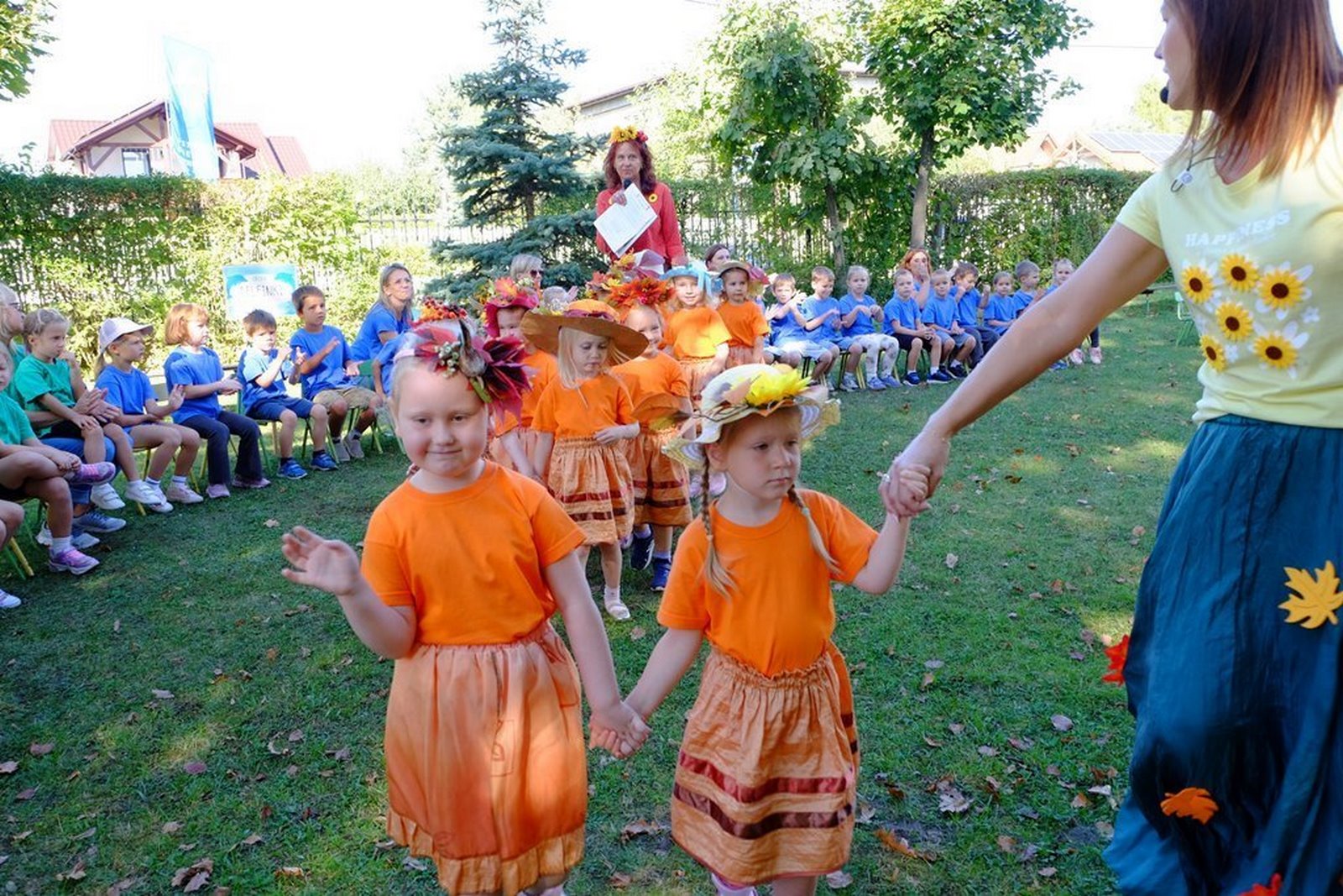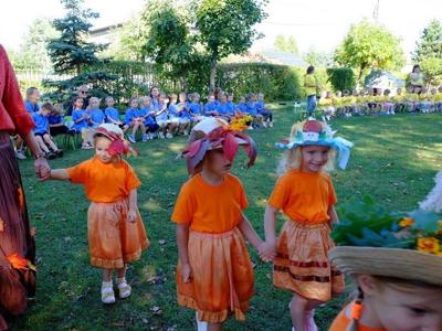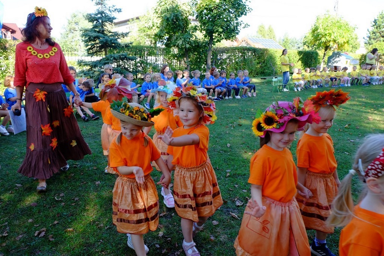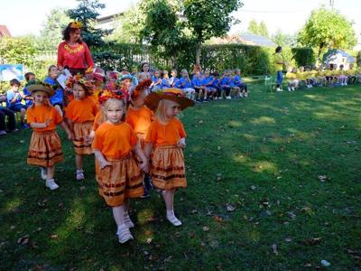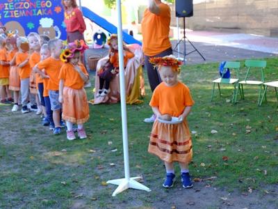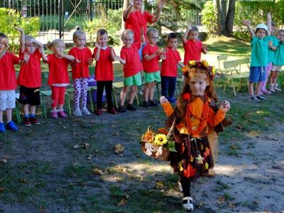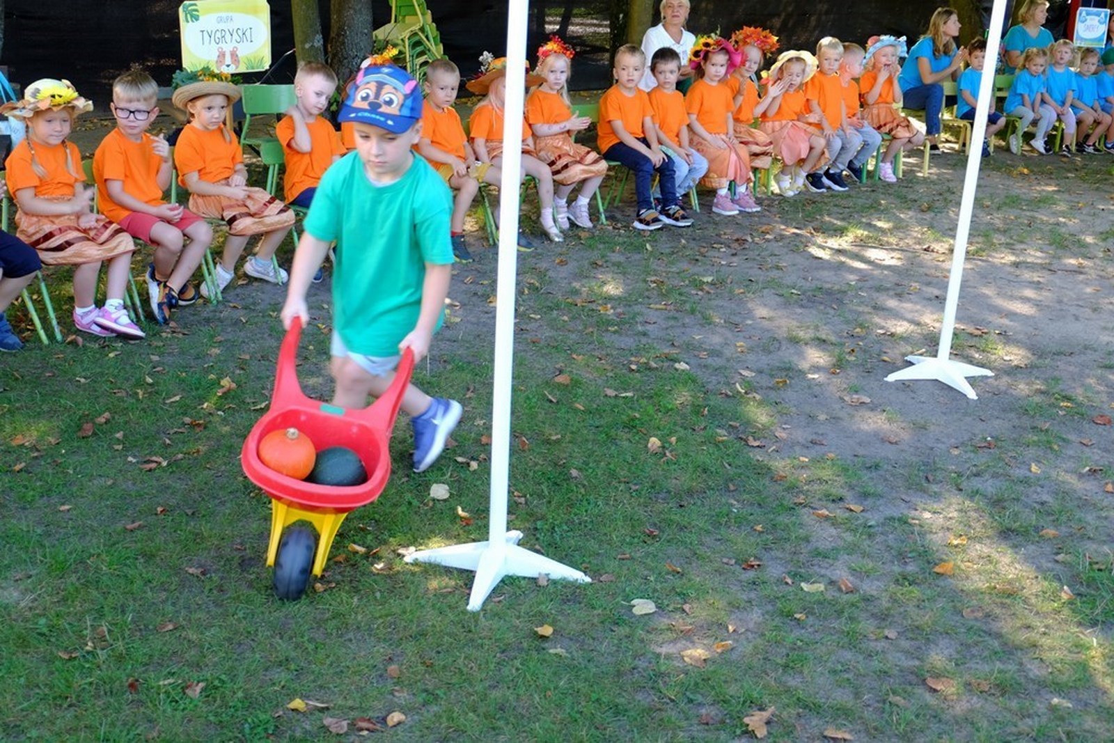 Pani Jesień przybyła z koszem pełnym darów z sadu, lasu i ogrodu. Przed całą społecznością przedszkolną zaprezentowały się również dziewczynki z grupy Tygryski prezentując jesienne nakrycia głowy ozdobione min. darami natury. Wszystkie przedszkolaki aktywnie uczestniczyły w zabawach muzycznych o tematyce jesiennej i konkurencjach przygotowanych specjalnie na tę okazję. Było to: zbieranie ziemniaków, noszenie ziemniaka na tacy, przewożenie dyń i kabaczków na taczkach. Dorośli wykazali się zręcznością podczas konkursu na obranie najdłuższej skórki z ziemniaka.