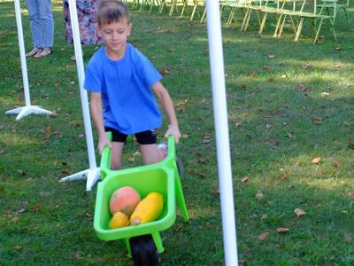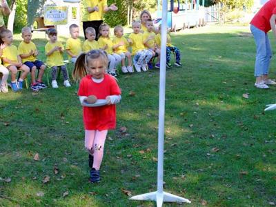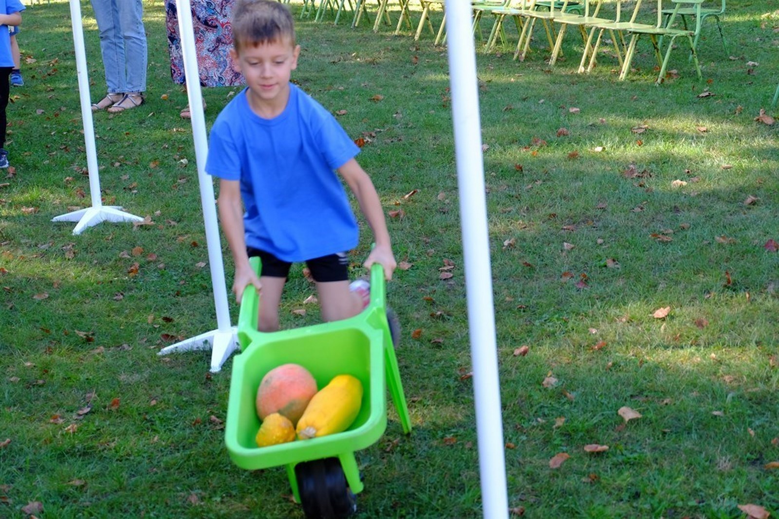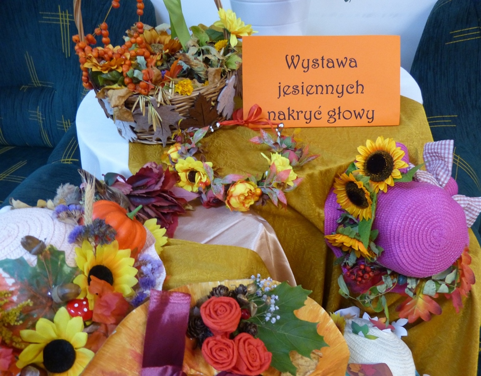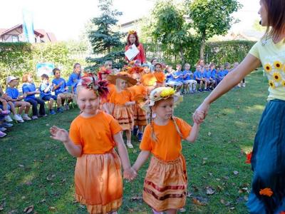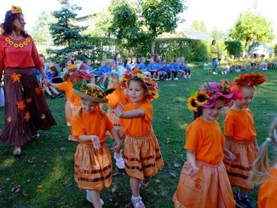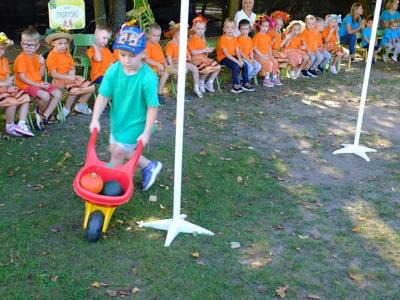 Pani Jesień przybyła z koszem pełnym darów z sadu, lasu i ogrodu. Przed całą społecznością przedszkolną zaprezentowały się również dziewczynki z grupy Tygryski prezentując jesienne nakrycia głowy ozdobione min. darami natury. Wszystkie przedszkolaki aktywnie uczestniczyły w zabawach muzycznych o tematyce jesiennej i konkurencjach przygotowanych specjalnie na tę okazję. Było to: zbieranie ziemniaków, noszenie ziemniaka na tacy, przewożenie dyń i kabaczków na taczkach. Dorośli wykazali się zręcznością podczas konkursu na obranie najdłuższej skórki z ziemniaka.
