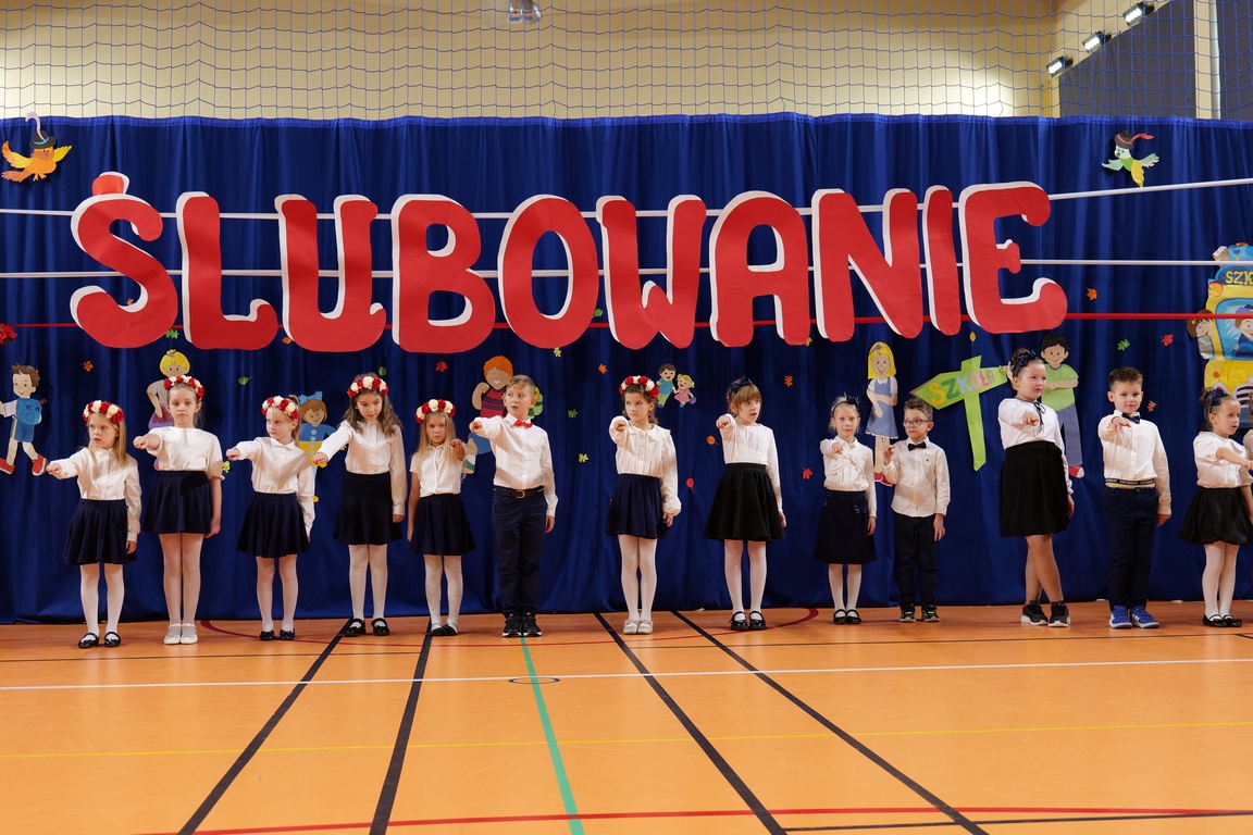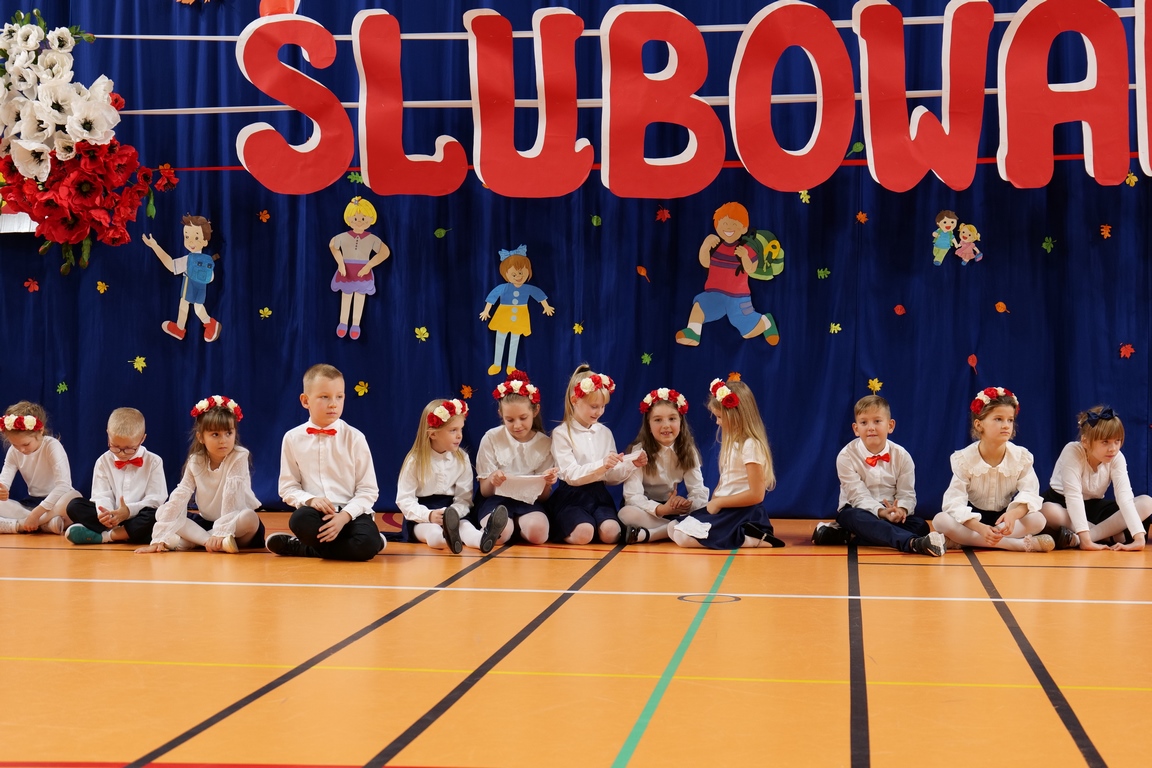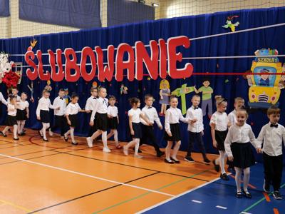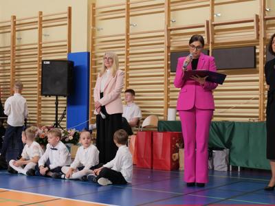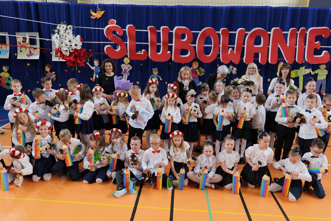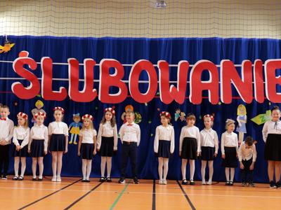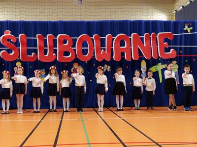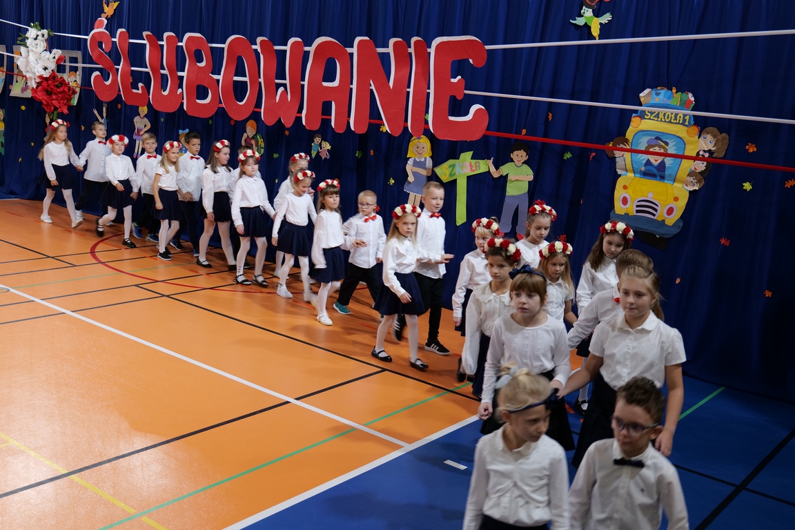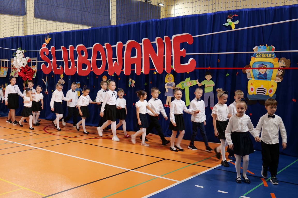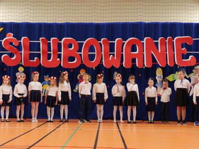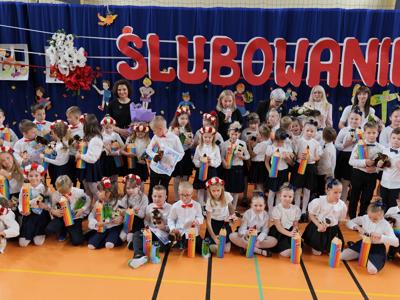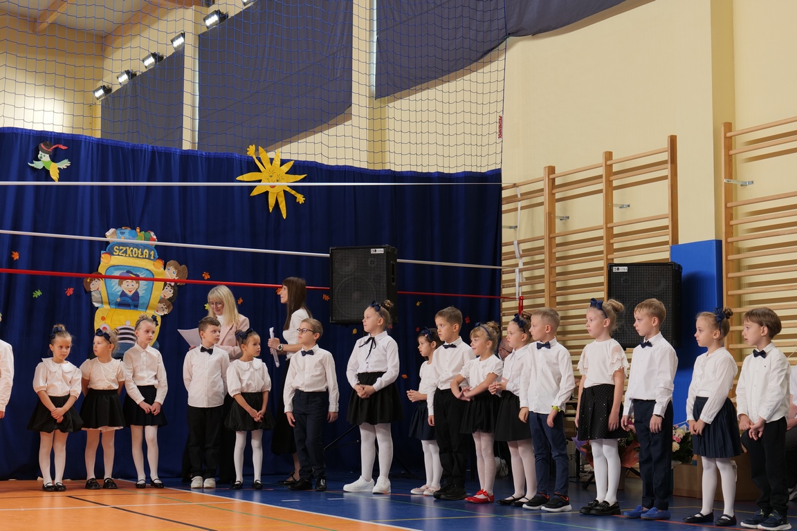 Po wprowadzeniu pocztu sztandarowego i odśpiewaniu „Mazurka Dąbrowskiego” uczniowie złożyli uroczyste ślubowanie i przez dyrektor szkoły zostali pasowani na ucznia. Otrzymali też legitymacje szkolne oraz mnóstwo życzeń i prezentów od gości. W imieniu burmistrza Dariusz Miernika, życzenia przekazała jego zastępczyni Agnieszka Jaszczur.