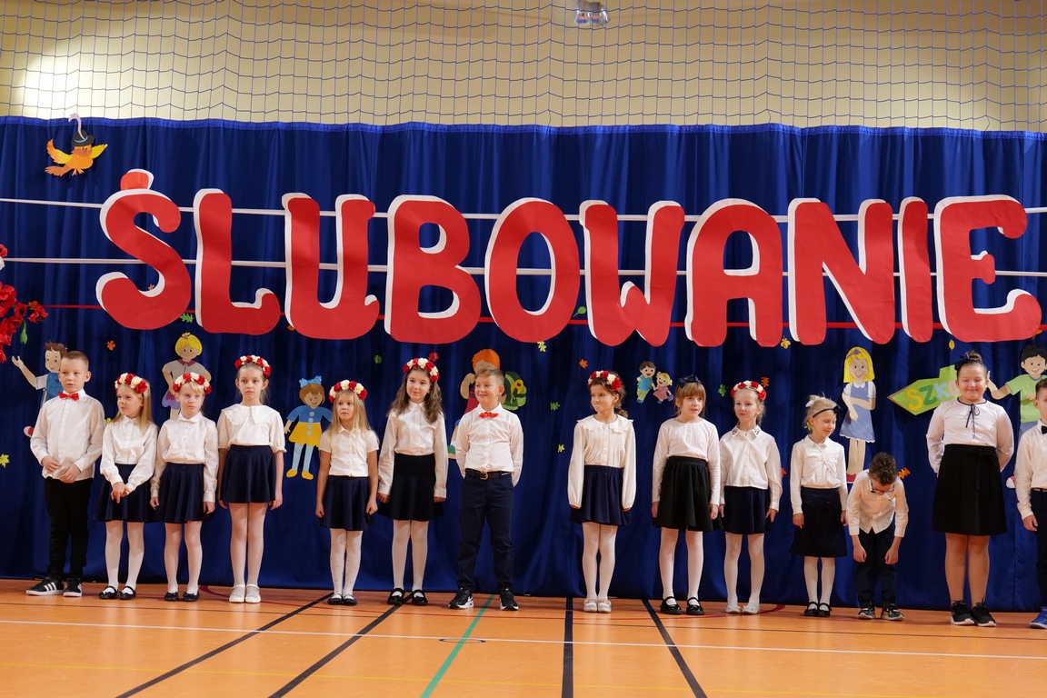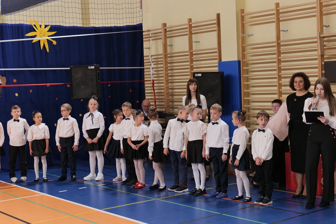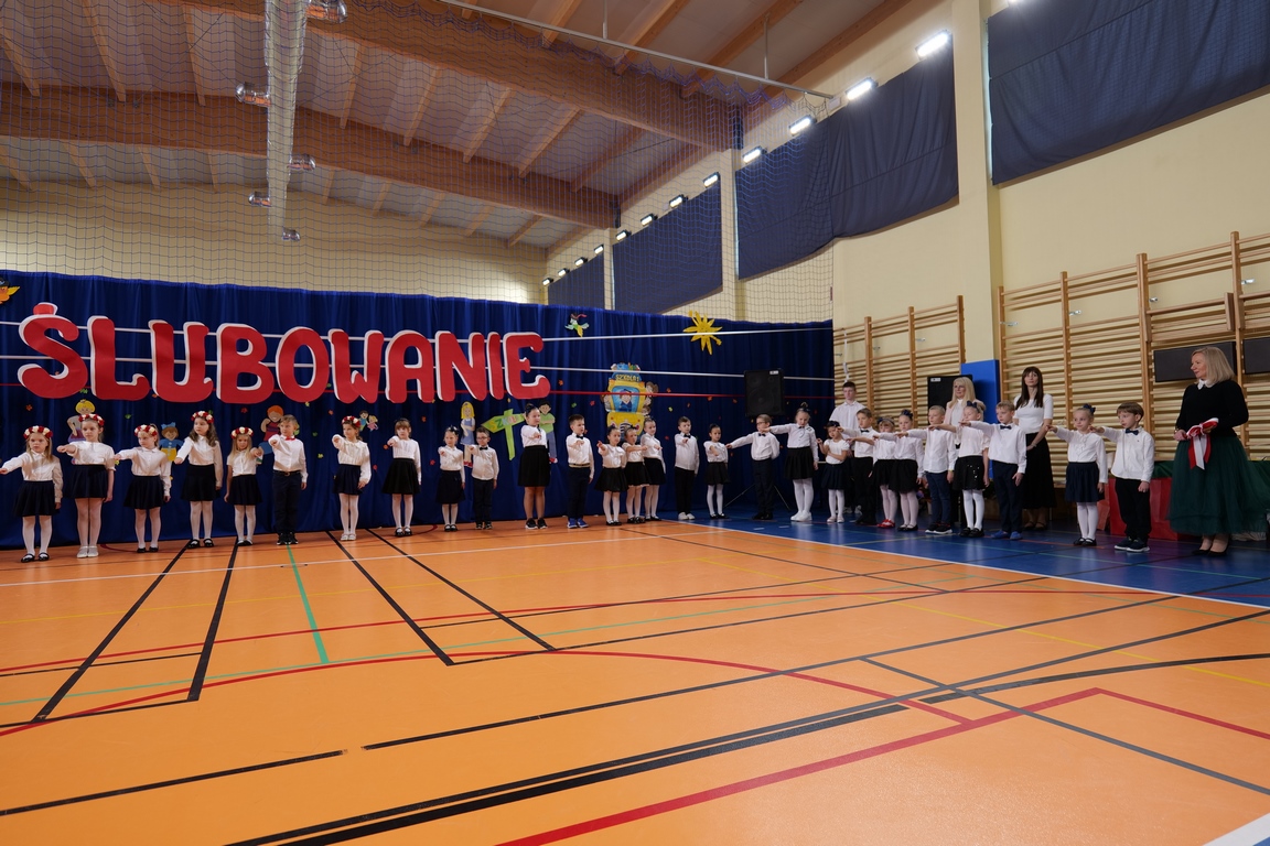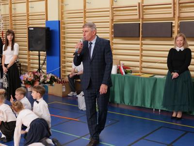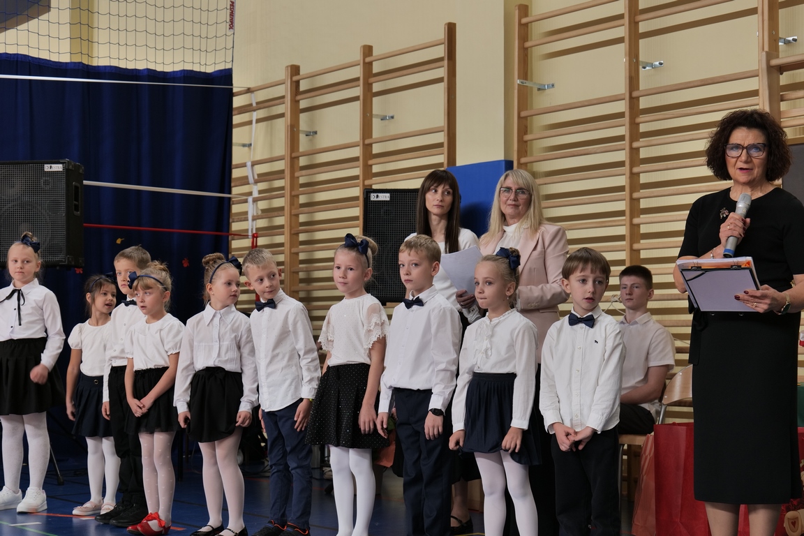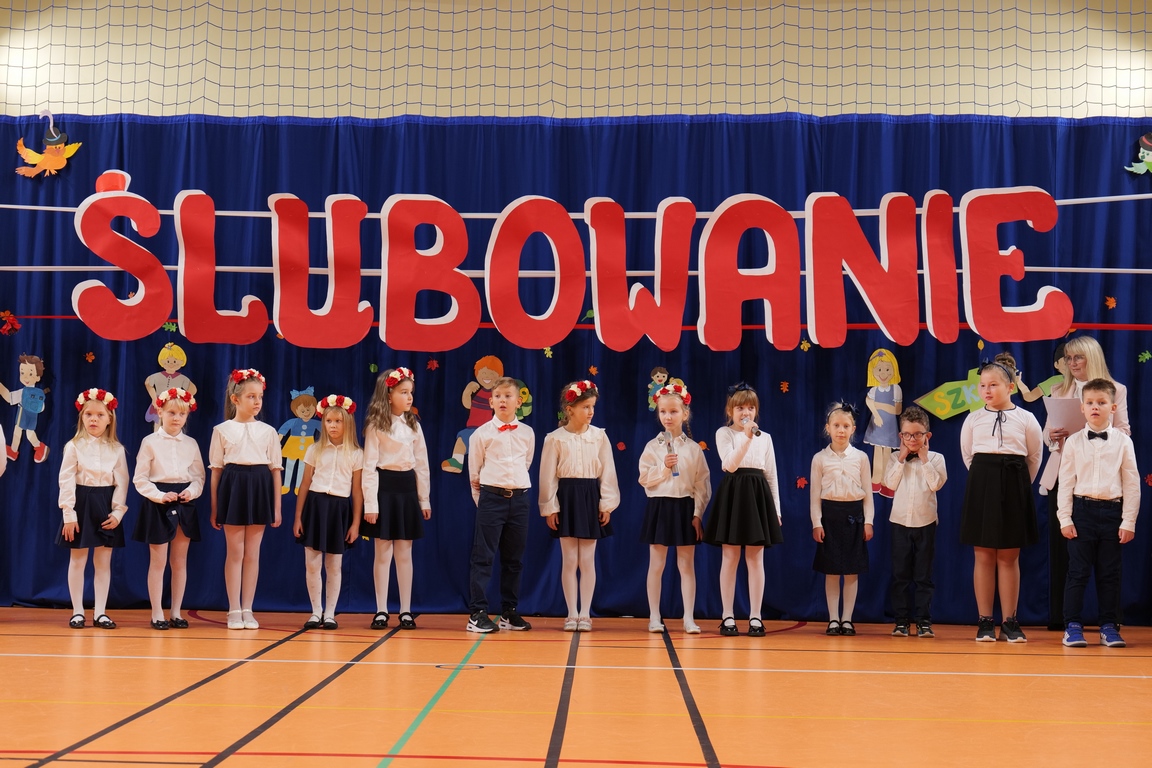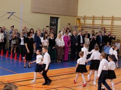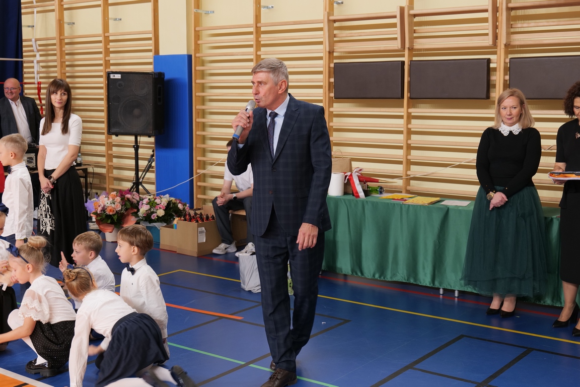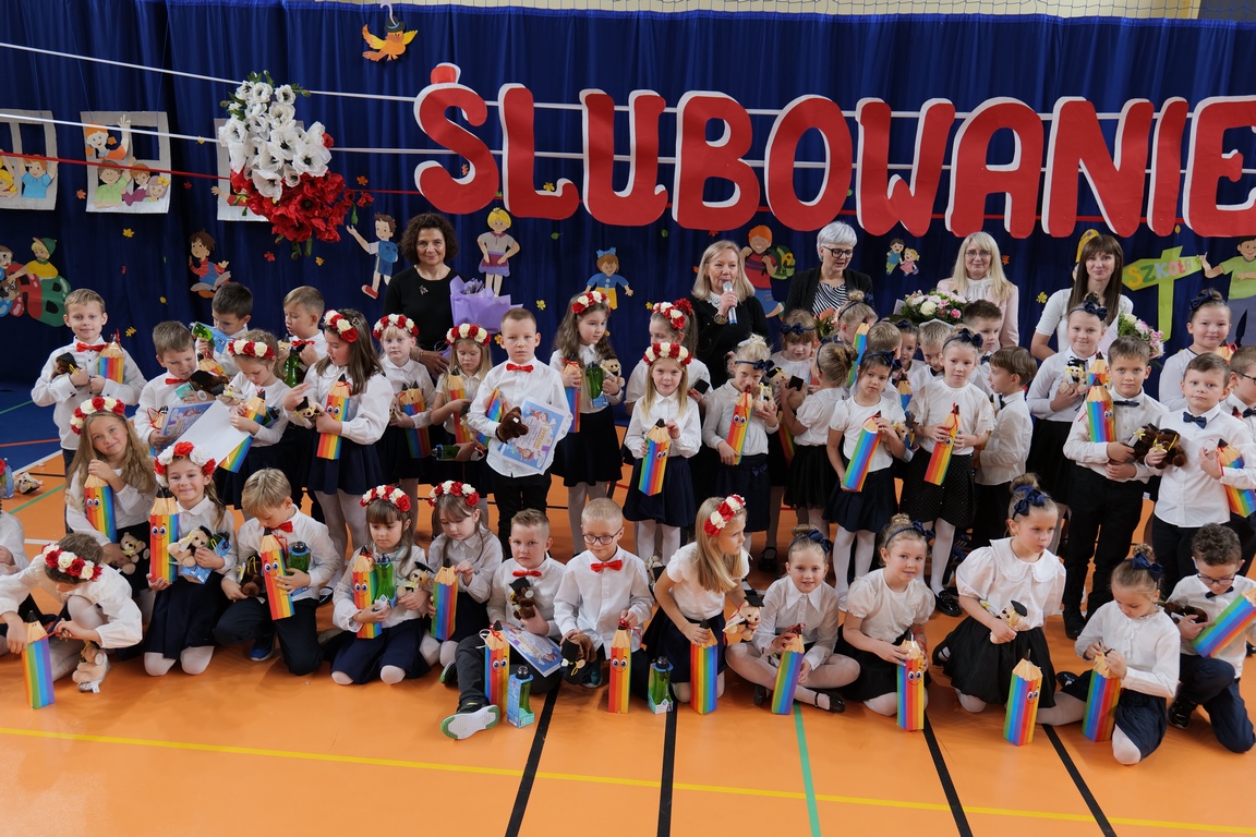 Po wprowadzeniu pocztu sztandarowego i odśpiewaniu „Mazurka Dąbrowskiego” uczniowie złożyli uroczyste ślubowanie i przez dyrektor szkoły zostali pasowani na ucznia. Otrzymali też legitymacje szkolne oraz mnóstwo życzeń i prezentów od gości. W imieniu burmistrza Dariusz Miernika, życzenia przekazała jego zastępczyni Agnieszka Jaszczur.