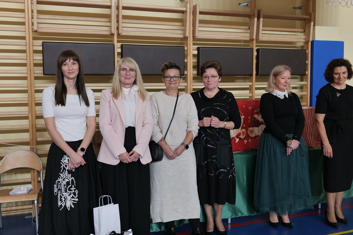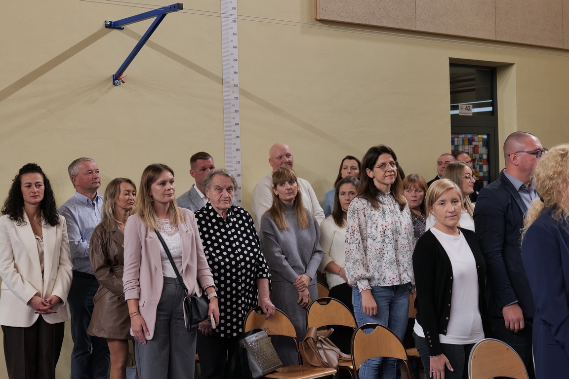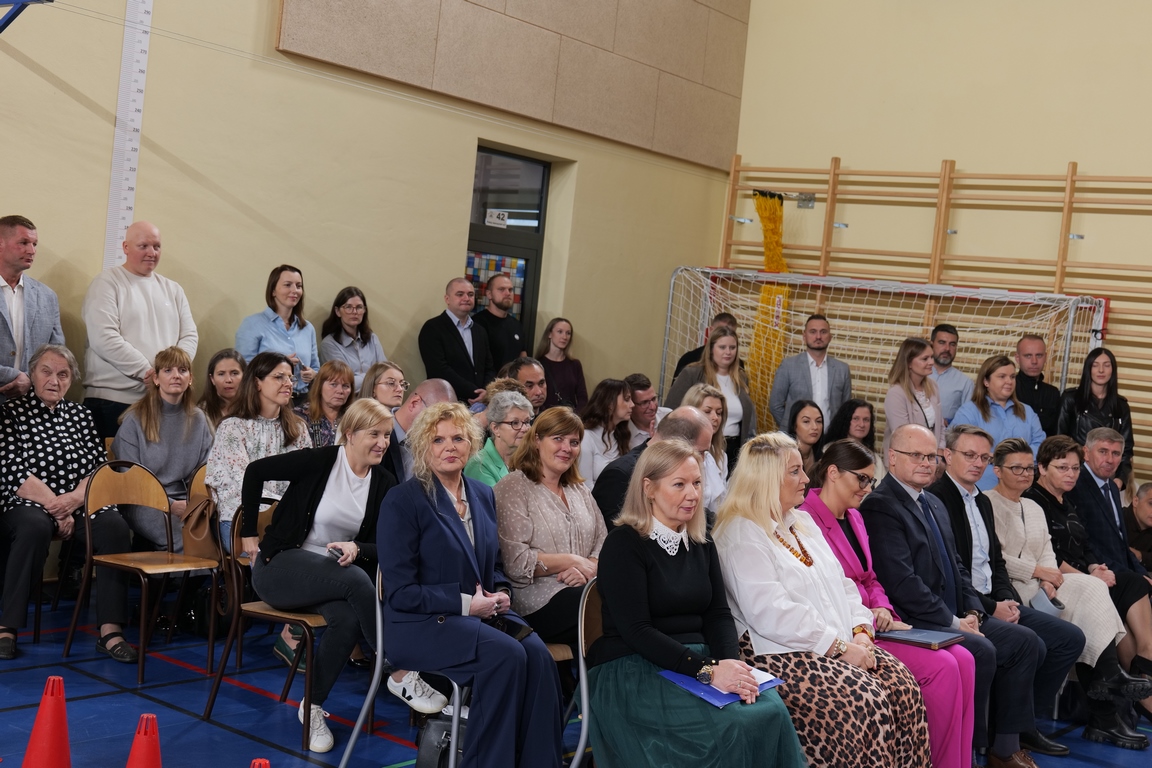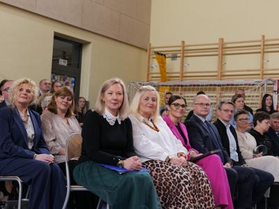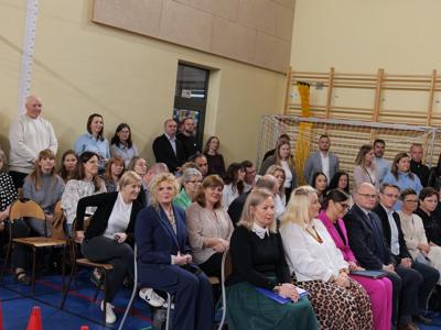 Przybyłych na uroczystość powitała oficjalnie prowadząca wydarzenia Jolanta Ambrozik, która wspólnie z Joanną Babiarz są wychowawczyniami klas pierwszych. Wspomaga ich w tym trudnym dziele Katarzyna Łakomiec, nauczyciel współorganizujący kształcenie. Wśród gości byli: zastępca burmistrza Agnieszka Jaszczur, inspektor ds. oświaty w magistracie Beata Kaszuba, ks. proboszcz Dariusz Pląsek, radny Szymon Lech, wiceprezes Banku Spółdzielczego Wojciech Gałczyński, prezes NZOZ „Promyk” Elżbieta Dziekan, dyrektor suchedniowskiej biblioteki Małgorzata Wiśniewska i przewodniczący rady rodziców Michał Barański.