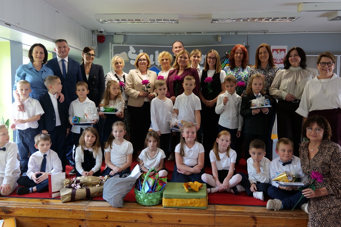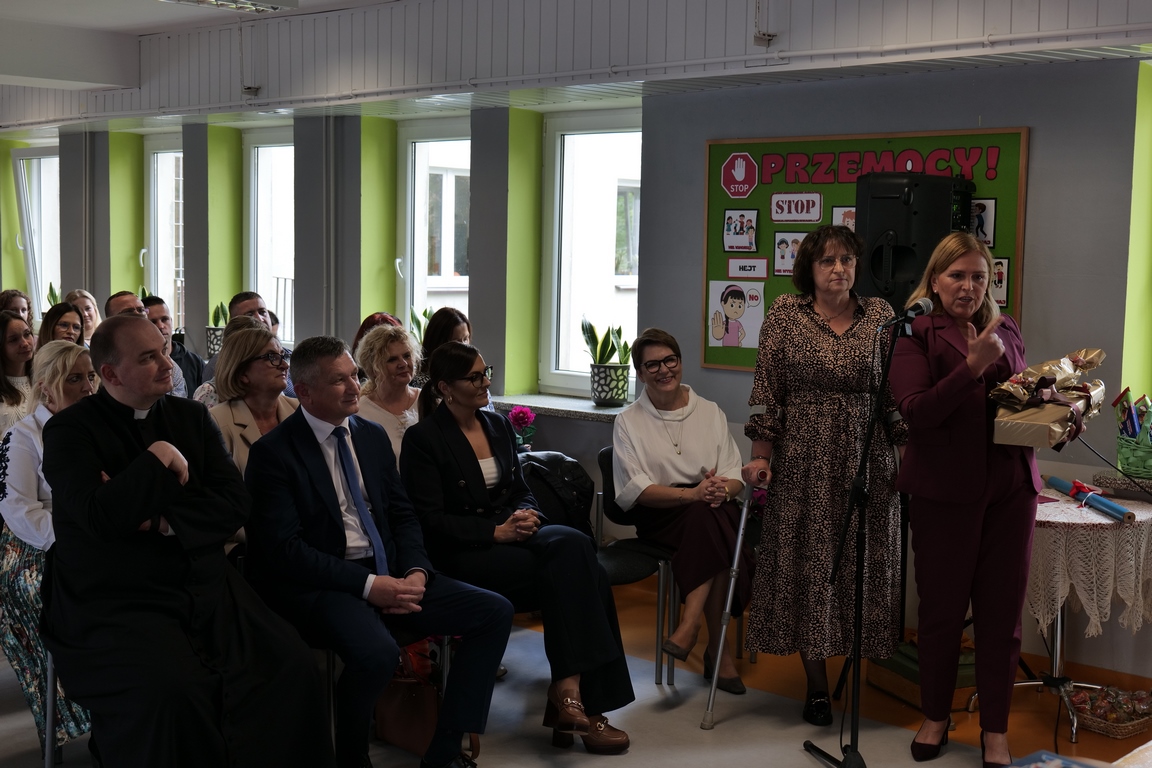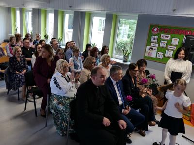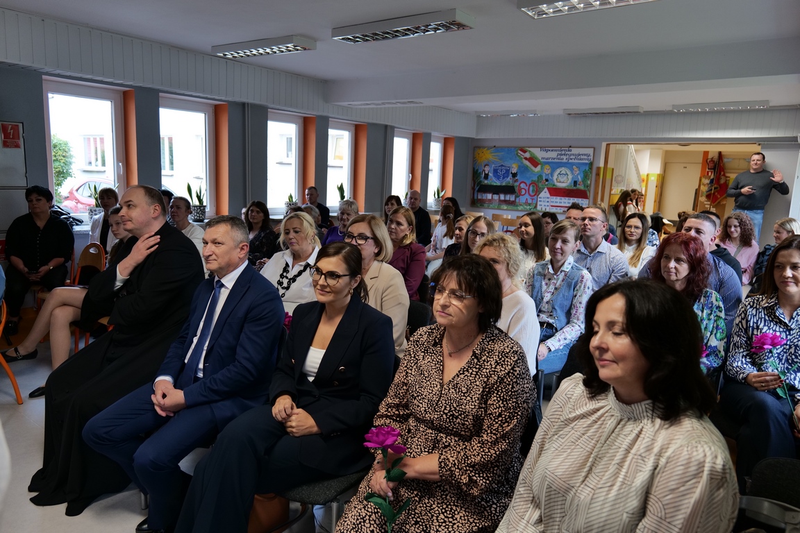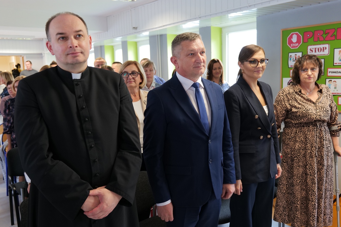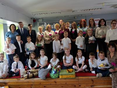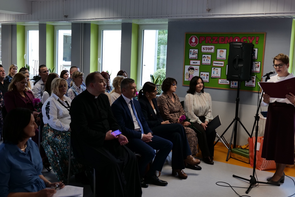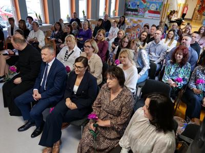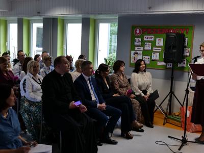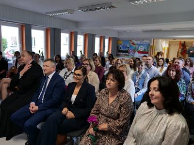 Przybyłych na uroczystość powitały dyrektor szkoły Renata Wikło i jej zastępczyni Magdalena Przygoda. Wśród gości byli: burmistrz Dariusz Miernik, przewodnicząca rady miejskiej Lidia Frątczak, ks. proboszcz Dariusz Pląsek, zastępca przewodniczącej Anna Salwa, zastępca burmistrza Agnieszka Jaszczur, inspektor ds. oświaty Beata Kaszuba, prezes Banku Spółdzielczego Agnieszka Fąfara-Markiewicz, dyrektor MGBP Małgorzata Wiśniewska, prezes ZNP Małgorzata Opala i zastępca przewodniczącego rady rodziców Paulina Duda.