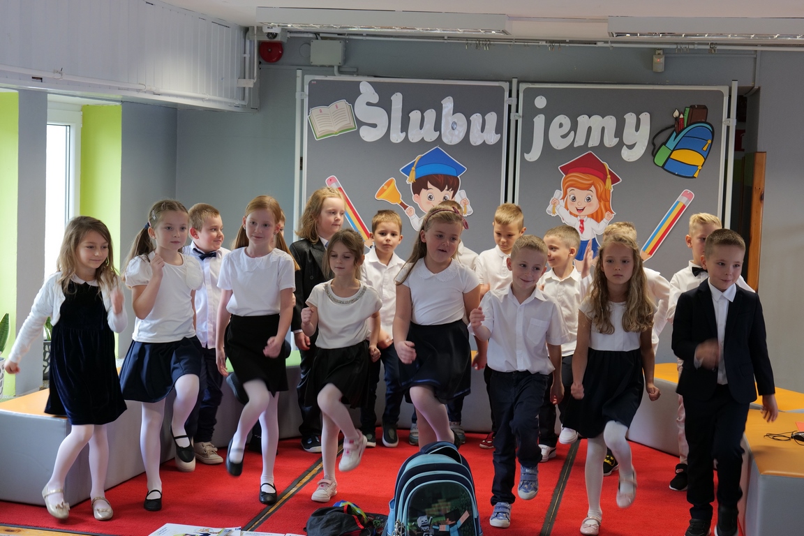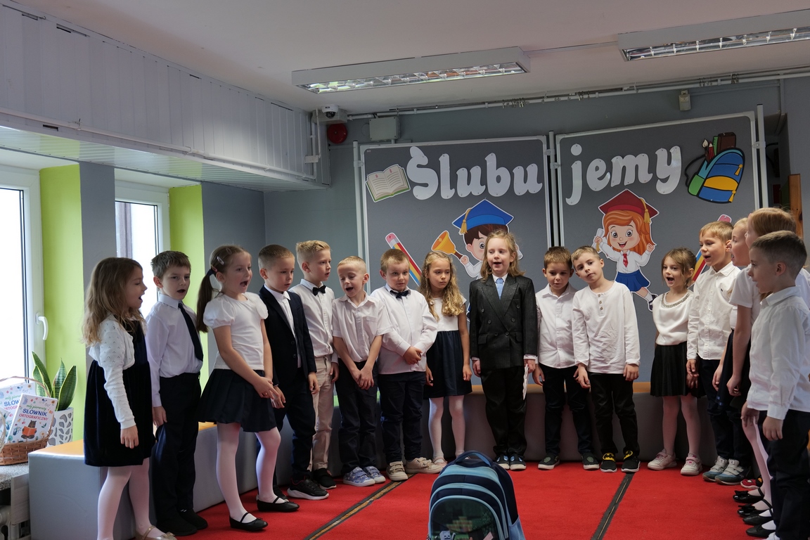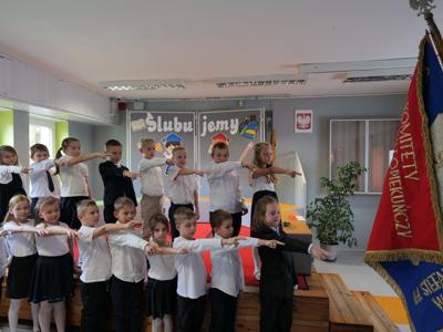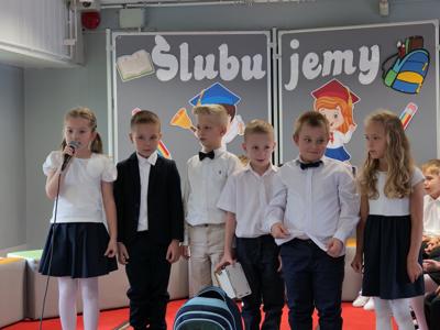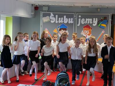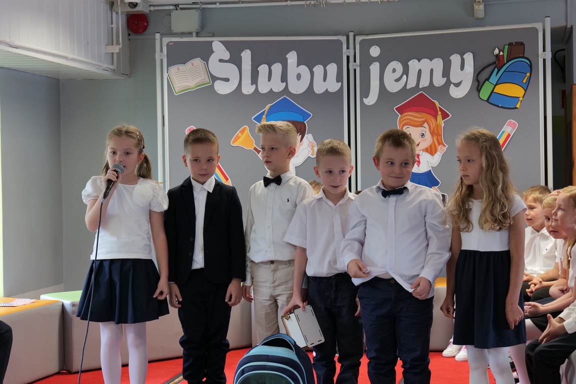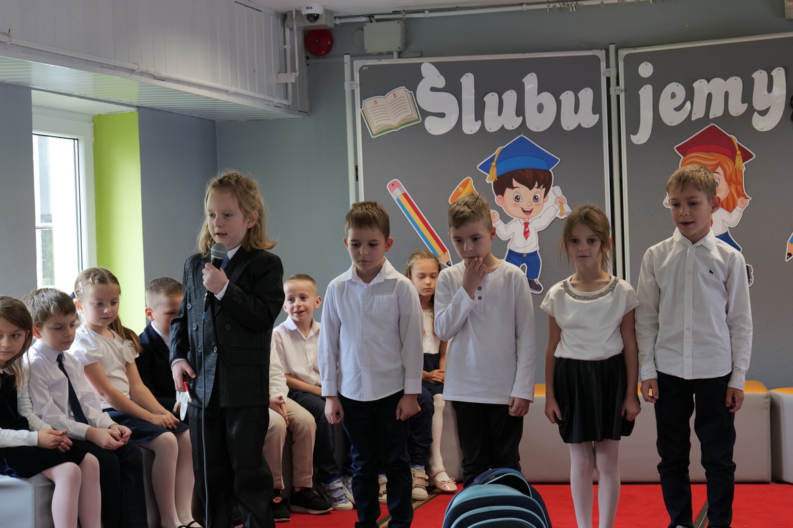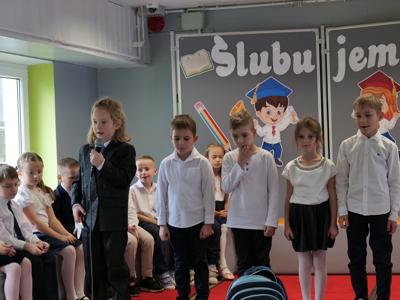Najpierw dzieci zaprezentowały swe duże już umiejętności artystyczne nabyte podczas pierwszych tygodni nauki. Później na sztandar szkoły złożyły ślubowanie, a dyrektor pasowała ich na ucznia. Od gości otrzymały moc życzeń oraz prezentów.