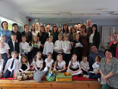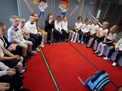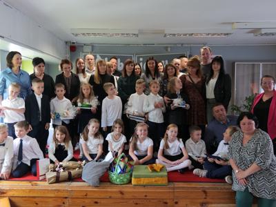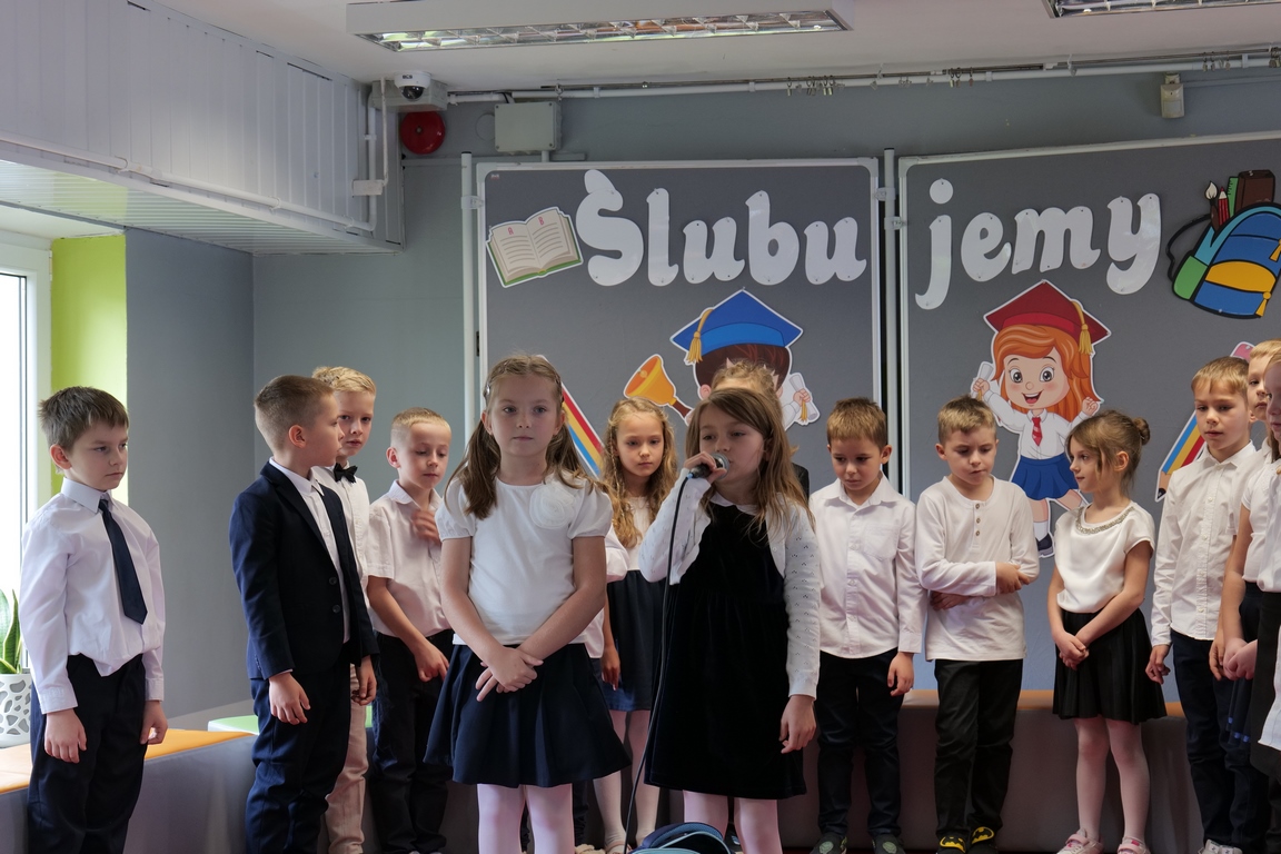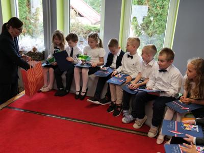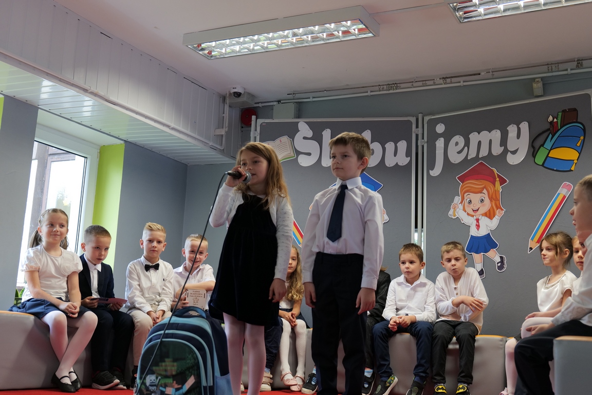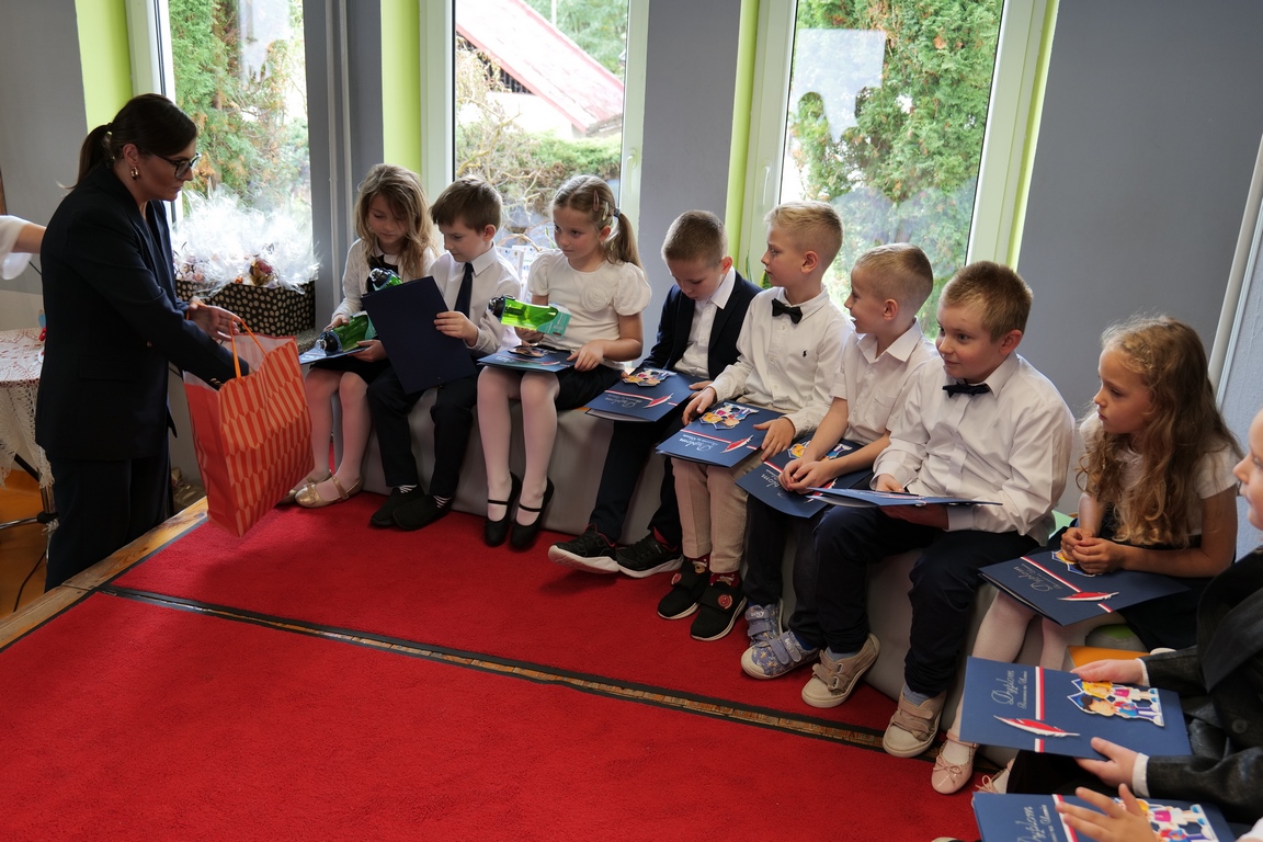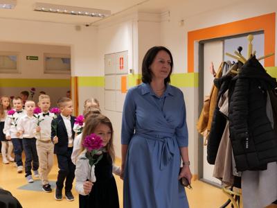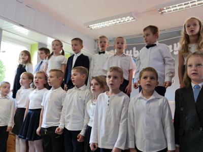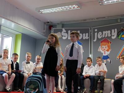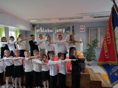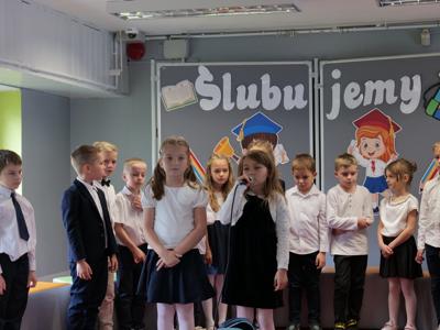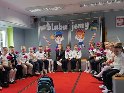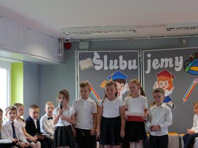 Najpierw dzieci zaprezentowały swe duże już umiejętności artystyczne nabyte podczas pierwszych tygodni nauki. Później na sztandar szkoły złożyły ślubowanie, a dyrektor pasowała ich na ucznia. Od gości otrzymały moc życzeń oraz prezentów.