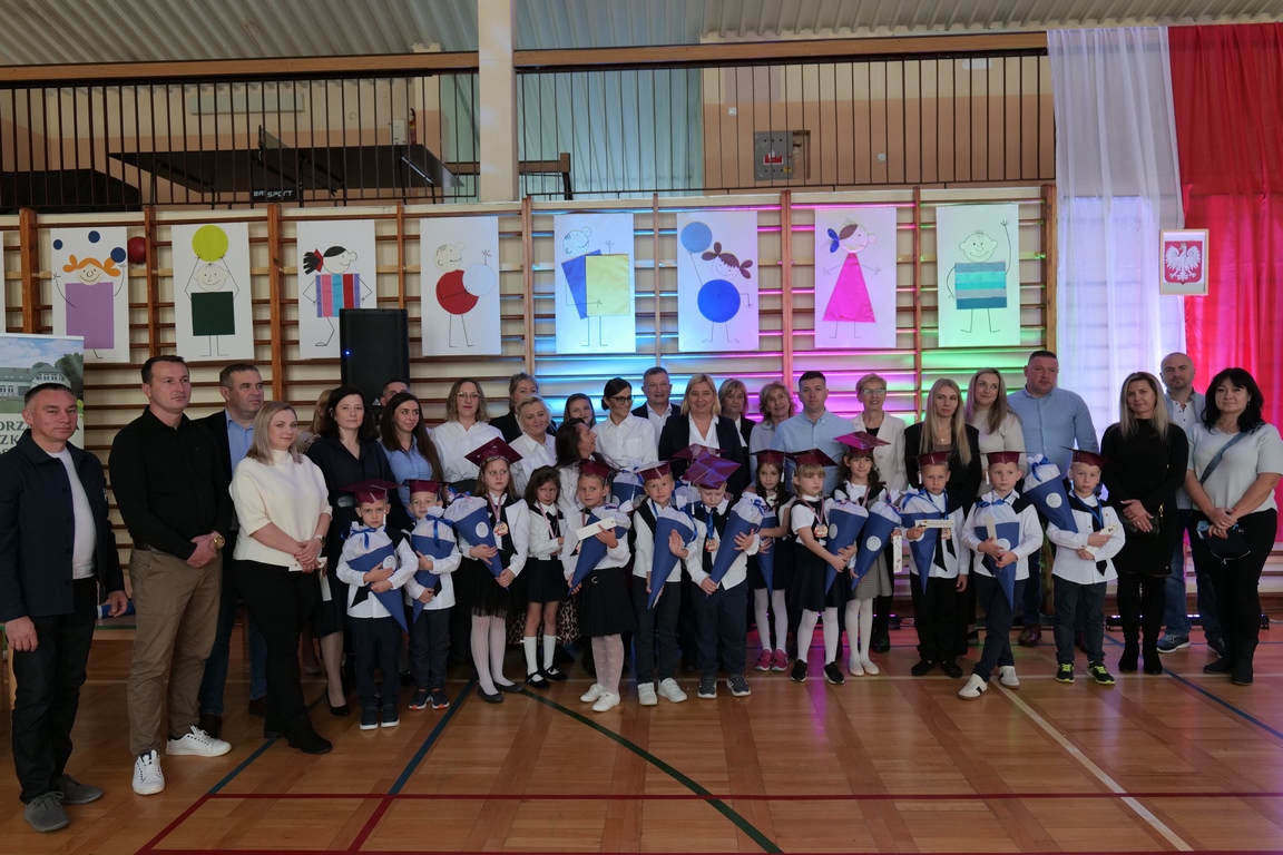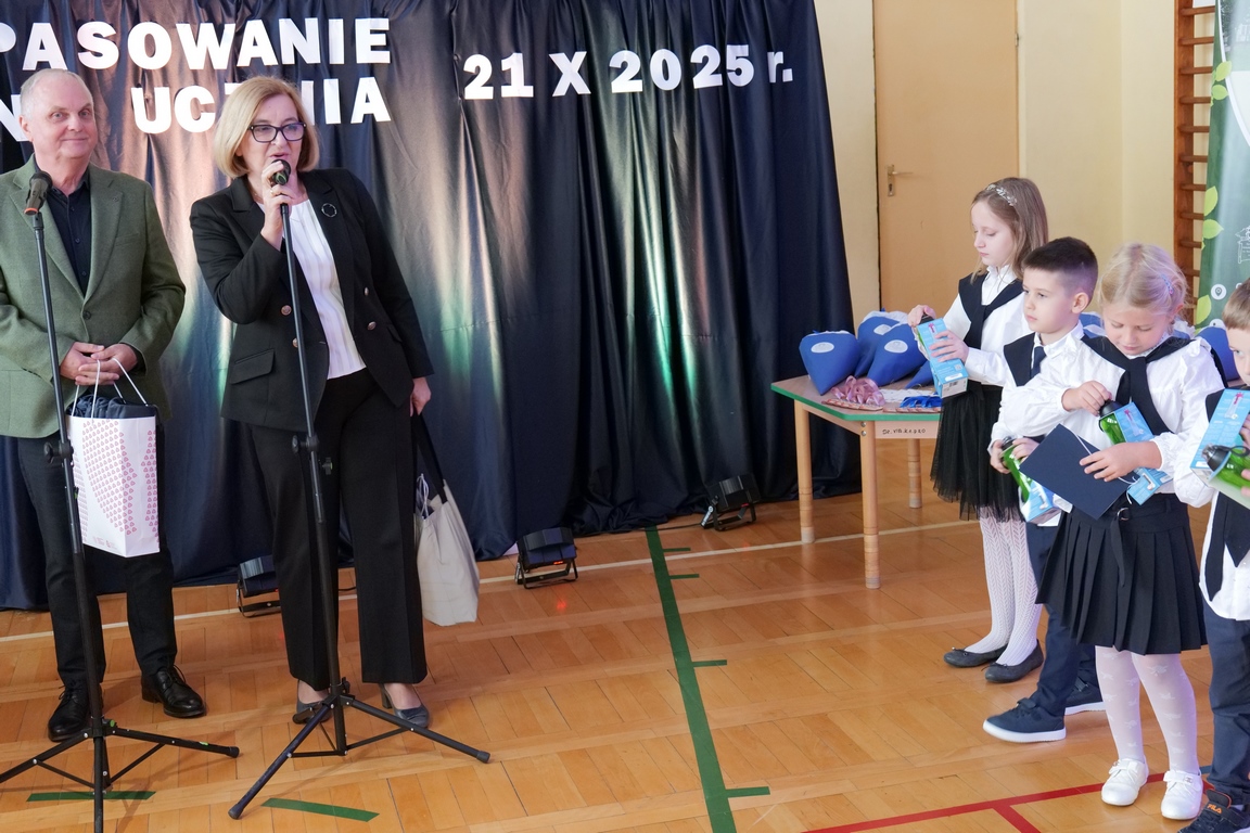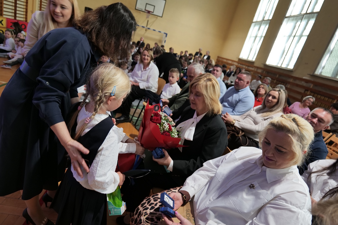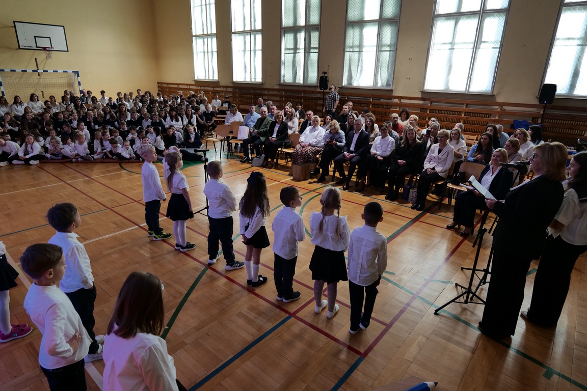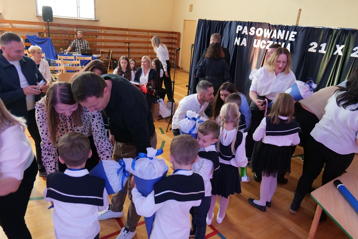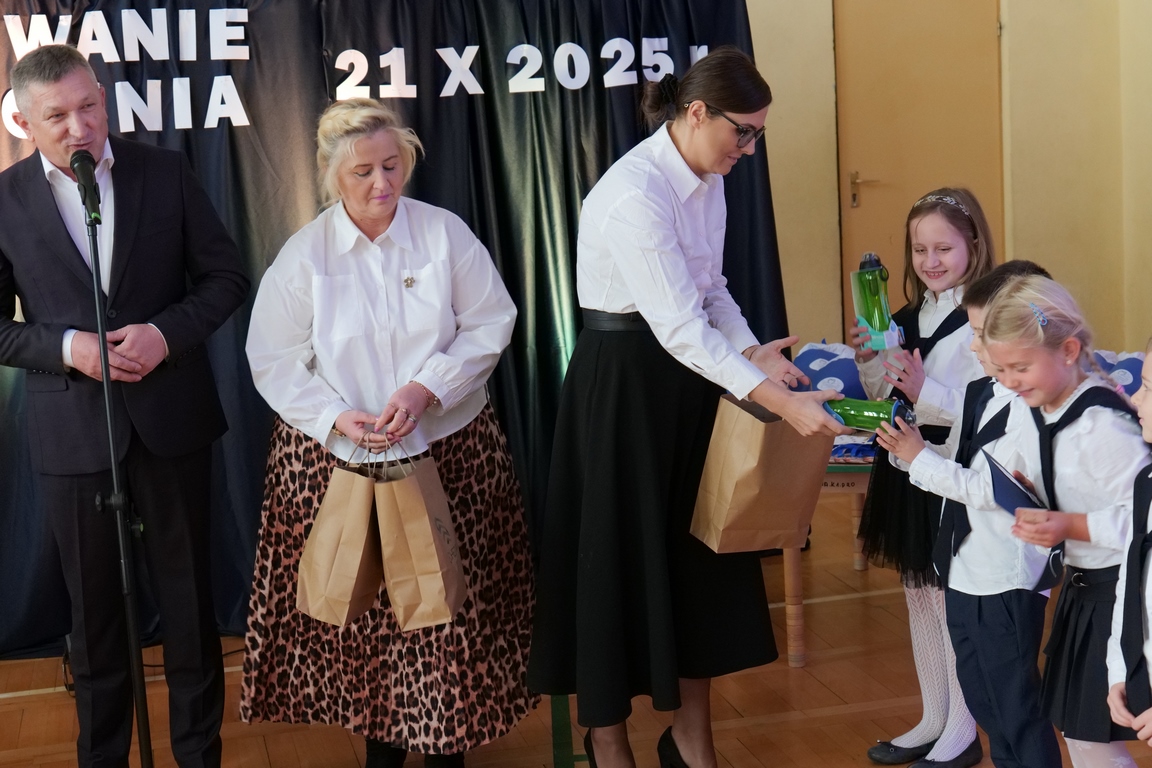 Nie zabrakło również wzruszających chwil i gestów wdzięczności. Dzieci wręczyły upominki zaproszonym gościom, dziękując za obecność i wsparcie w tak ważnym dla nich dniu. W dalszej części uroczystości głos zabrali goście honorowi, którzy skierowali do pierwszoklasistów wiele serdecznych słów i życzeń. Ciepłe słowa płynęły również od rodziców, którzy z dumą i wzruszeniem patrzyli na swoje pociechy, a następnie wręczyli im symboliczne „rogi obfitości”, wypełnione słodyczami i drobnymi upominkami.