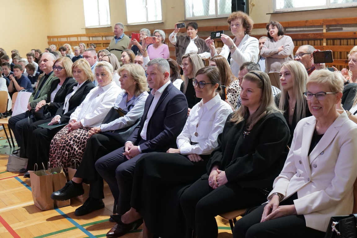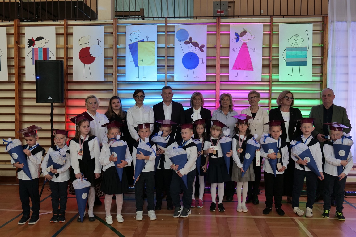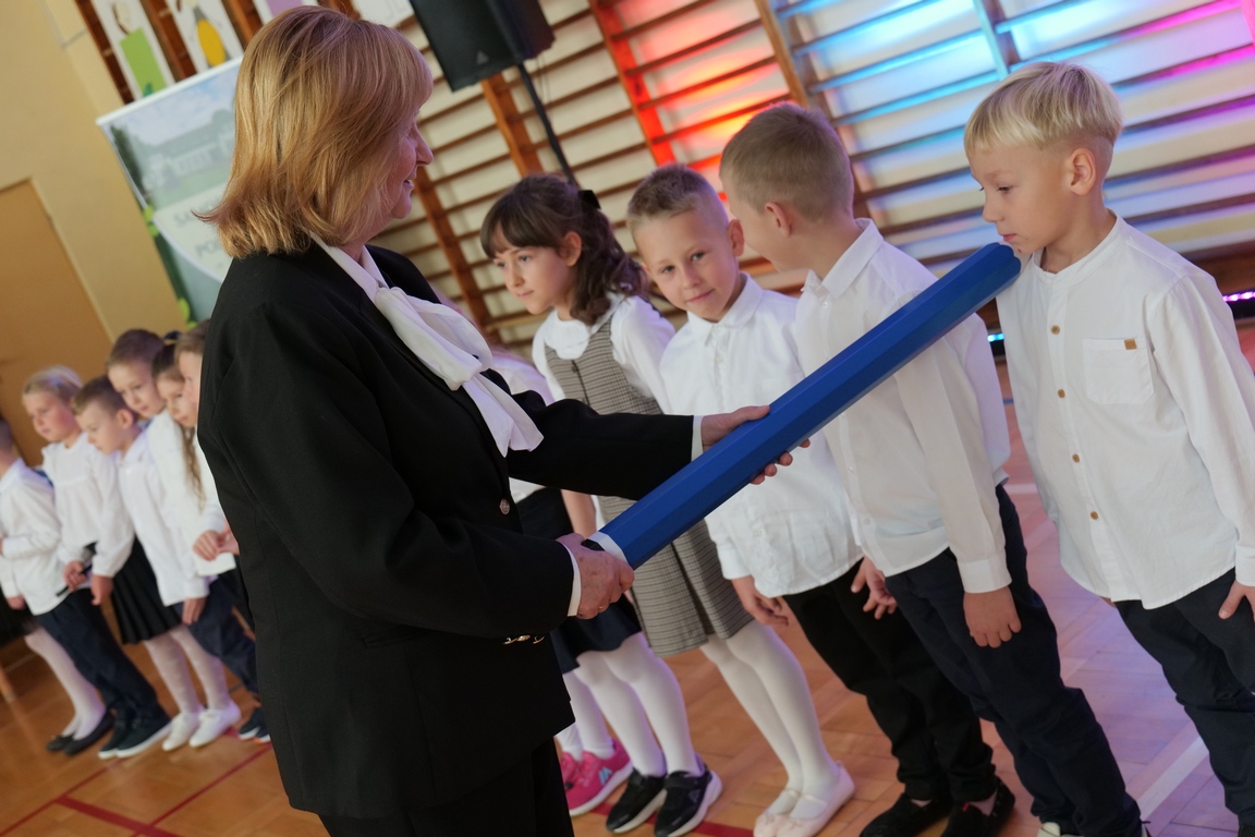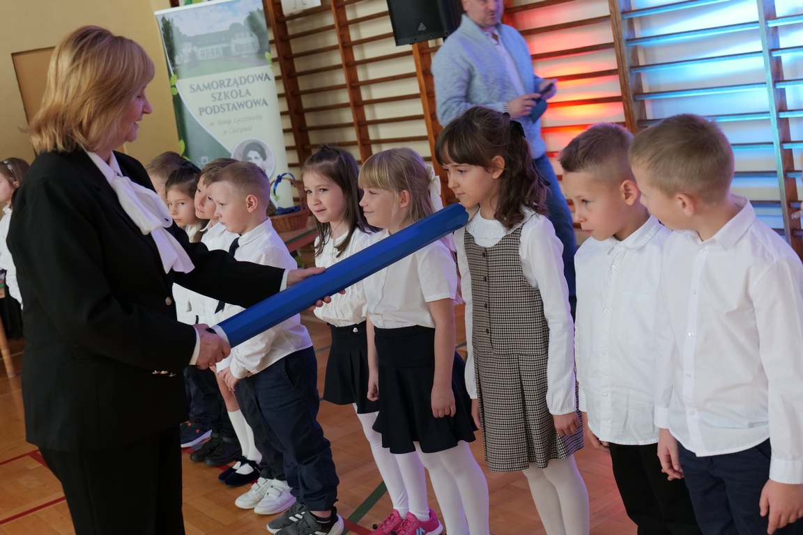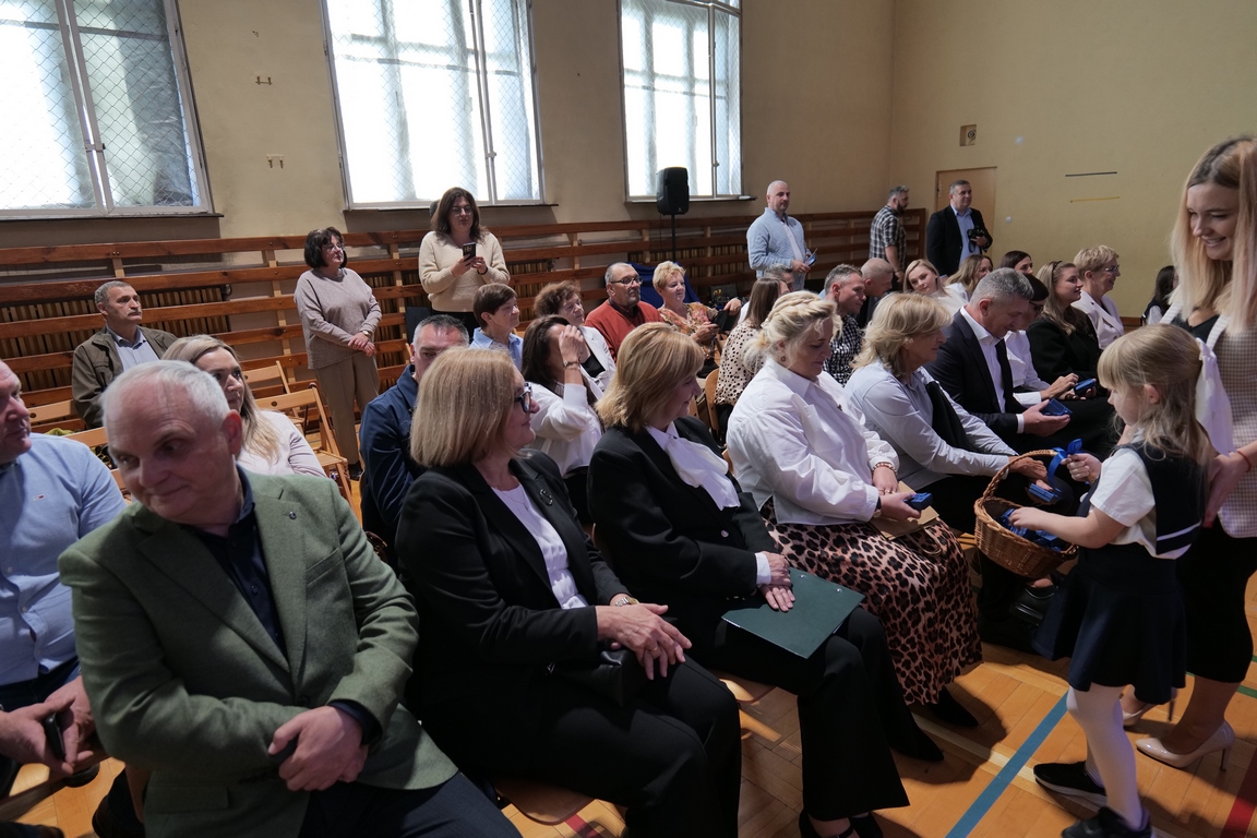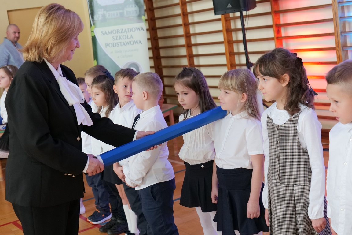 Nie zabrakło również wzruszających chwil i gestów wdzięczności. Dzieci wręczyły upominki zaproszonym gościom, dziękując za obecność i wsparcie w tak ważnym dla nich dniu. W dalszej części uroczystości głos zabrali goście honorowi, którzy skierowali do pierwszoklasistów wiele serdecznych słów i życzeń. Ciepłe słowa płynęły również od rodziców, którzy z dumą i wzruszeniem patrzyli na swoje pociechy, a następnie wręczyli im symboliczne „rogi obfitości”, wypełnione słodyczami i drobnymi upominkami.