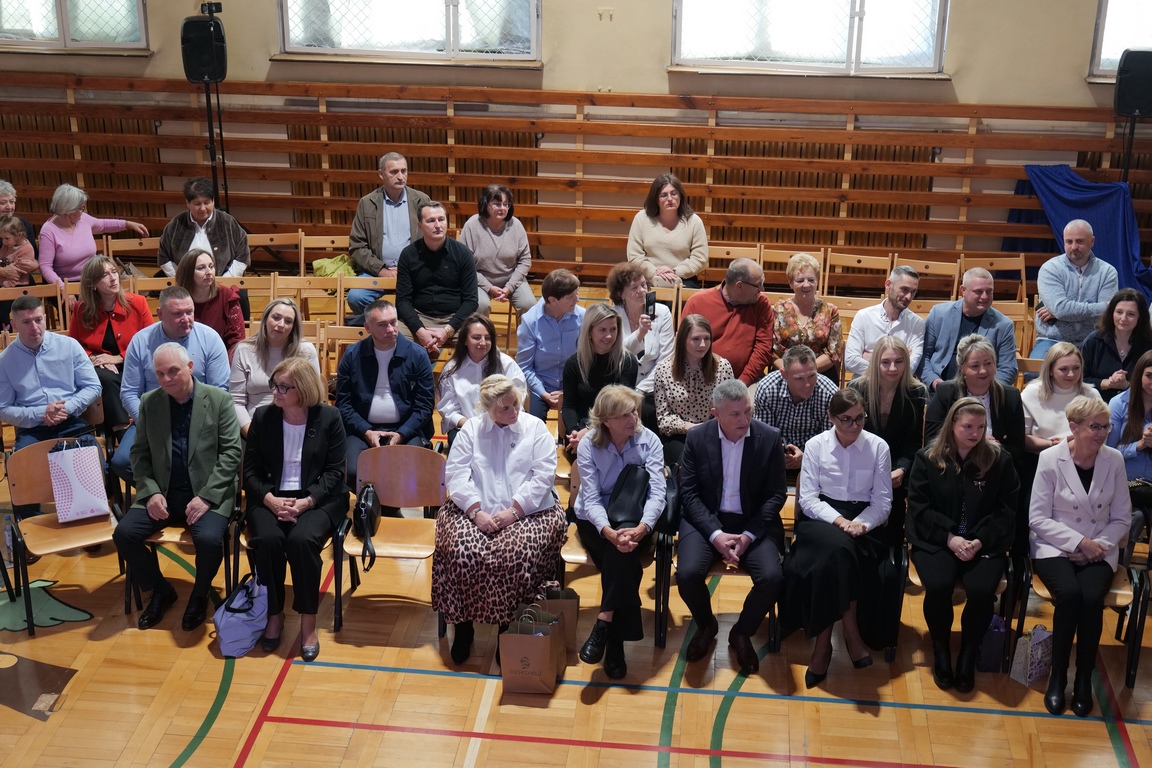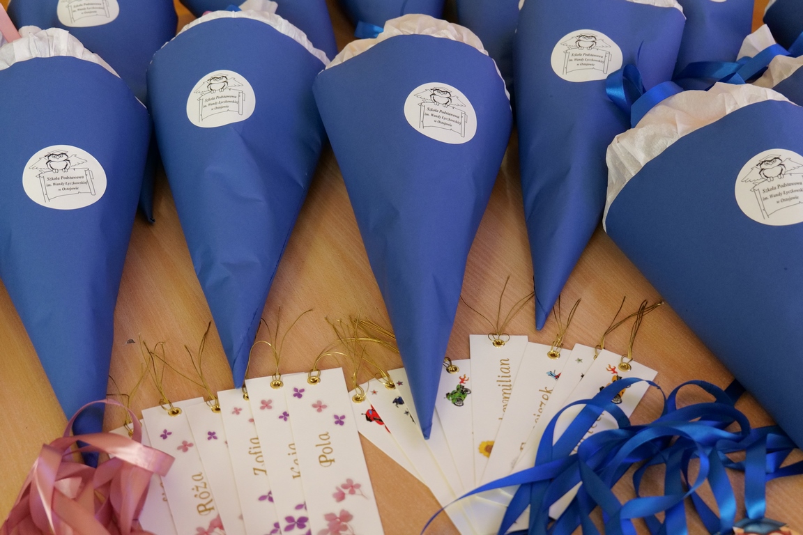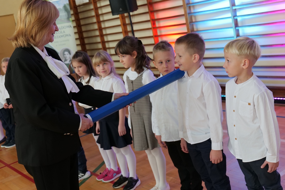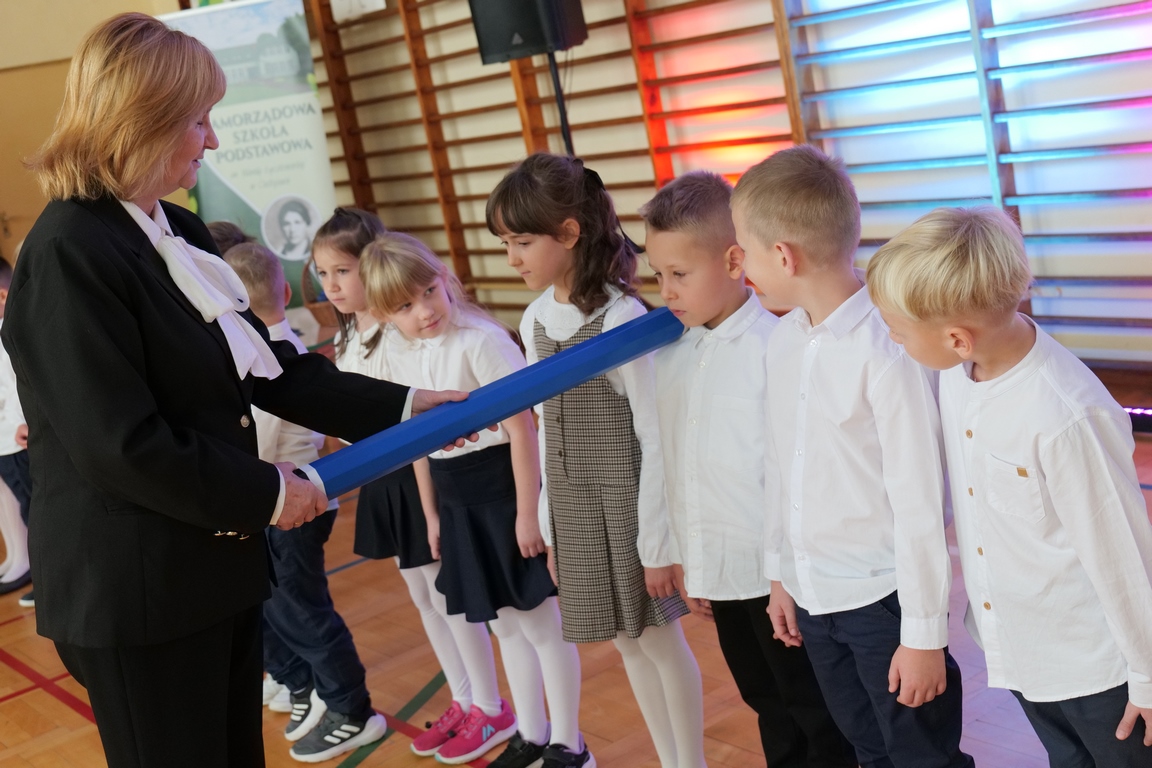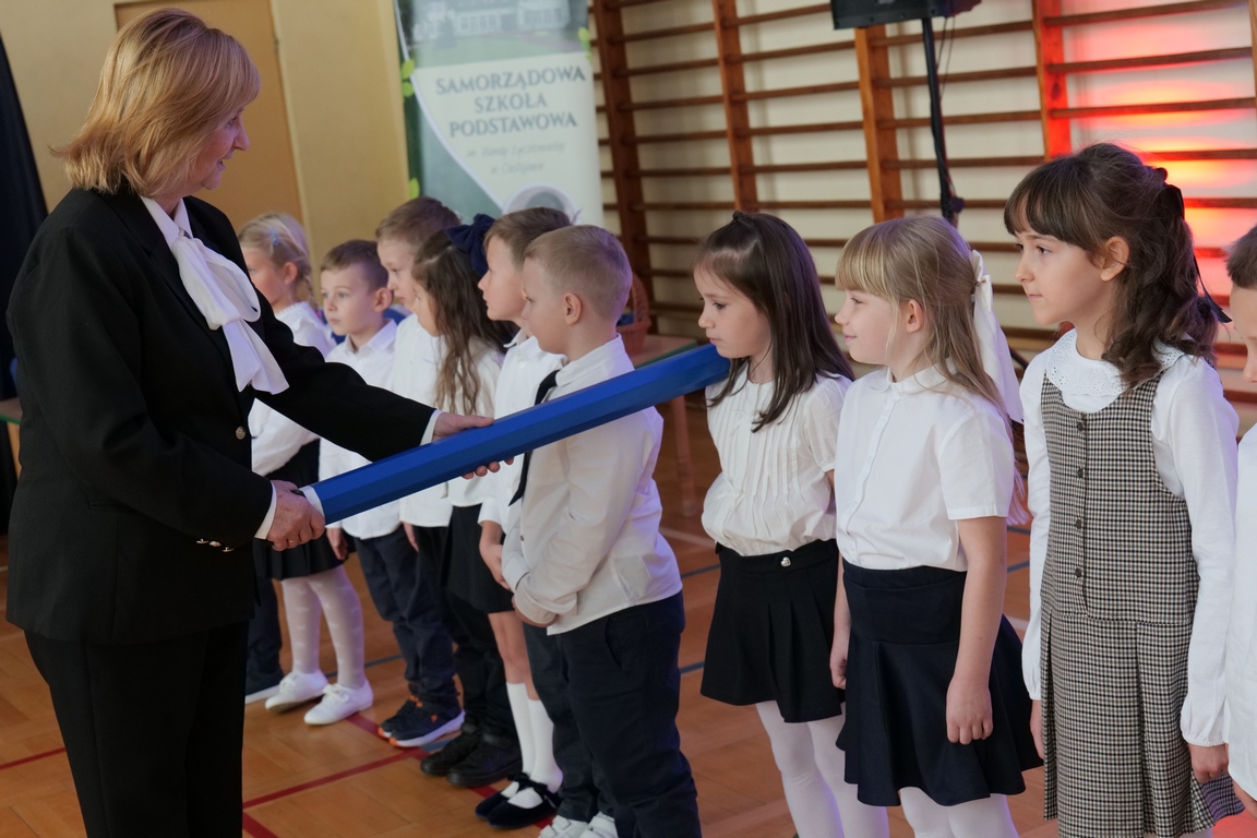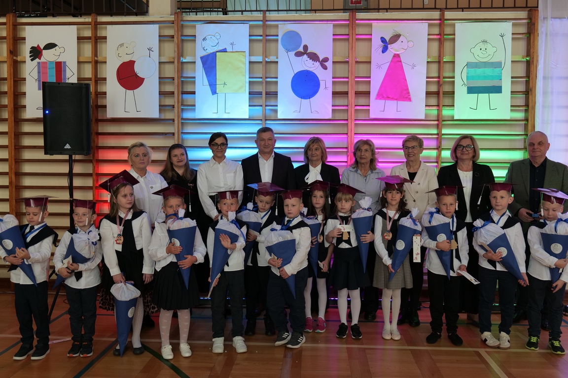 Nie zabrakło również wzruszających chwil i gestów wdzięczności. Dzieci wręczyły upominki zaproszonym gościom, dziękując za obecność i wsparcie w tak ważnym dla nich dniu. W dalszej części uroczystości głos zabrali goście honorowi, którzy skierowali do pierwszoklasistów wiele serdecznych słów i życzeń. Ciepłe słowa płynęły również od rodziców, którzy z dumą i wzruszeniem patrzyli na swoje pociechy, a następnie wręczyli im symboliczne „rogi obfitości”, wypełnione słodyczami i drobnymi upominkami.