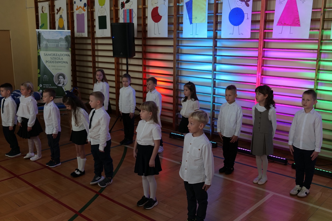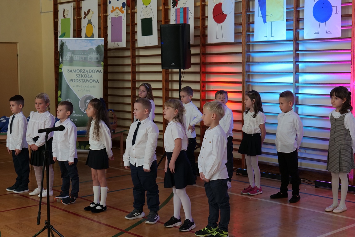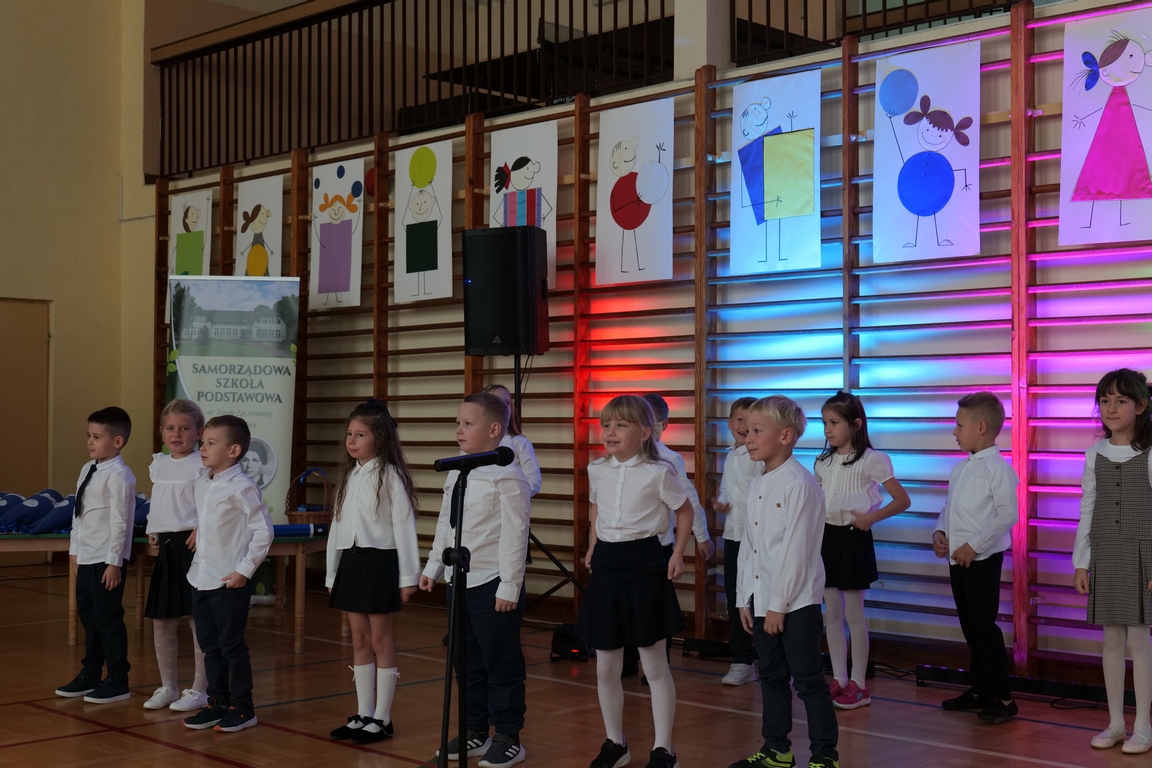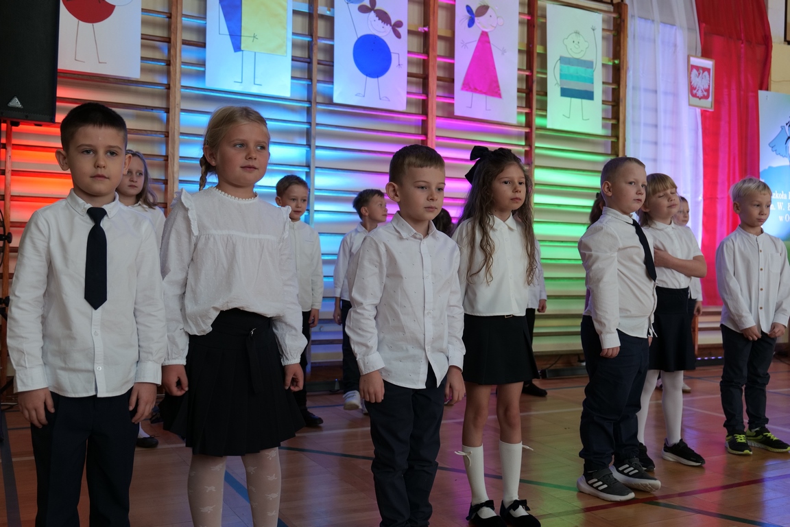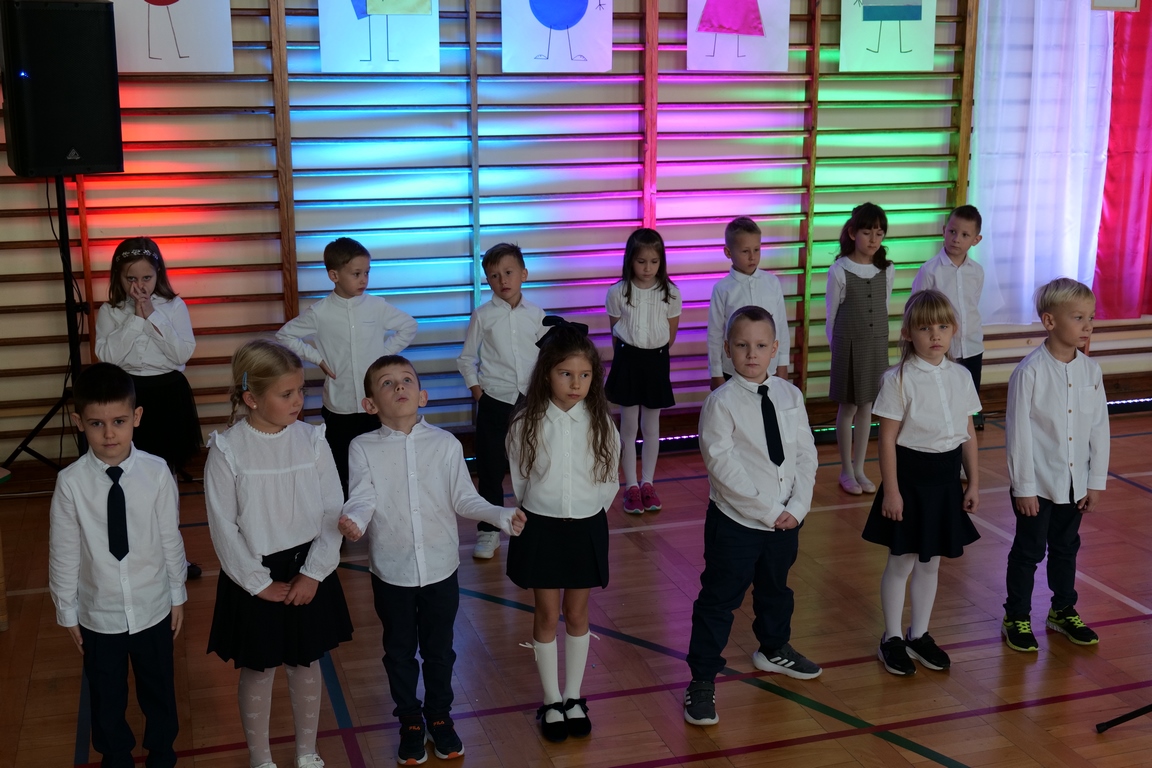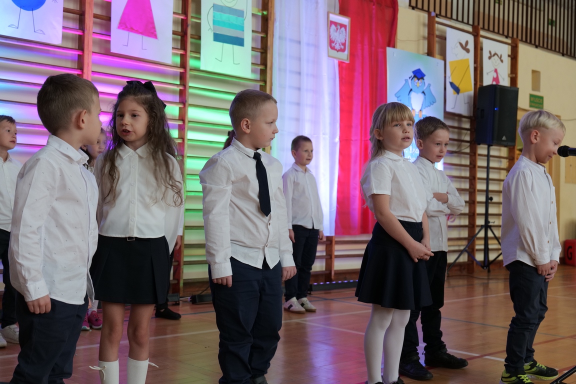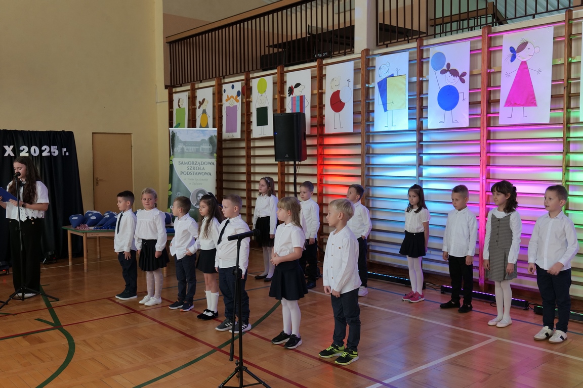 Następnie rozpoczęła się część artystyczna w wykonaniu pierwszoklasistów. Mali artyści, przygotowani przez wychowawczynię Agnieszkę Brzezińską, z wielkim zaangażowaniem śpiewali, recytowali i tańczyli, pokazując, że są już gotowi, by stać się pełnoprawnymi uczniami. Ich występ został nagrodzony gromkimi brawami. Całość uroczystości współprowadziła uczennica klasy VIII Zuzanna Połeć, przewodnicząca samorządu uczniowskiego..