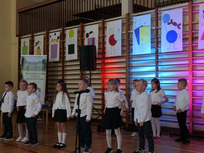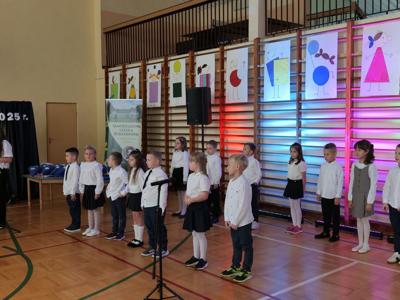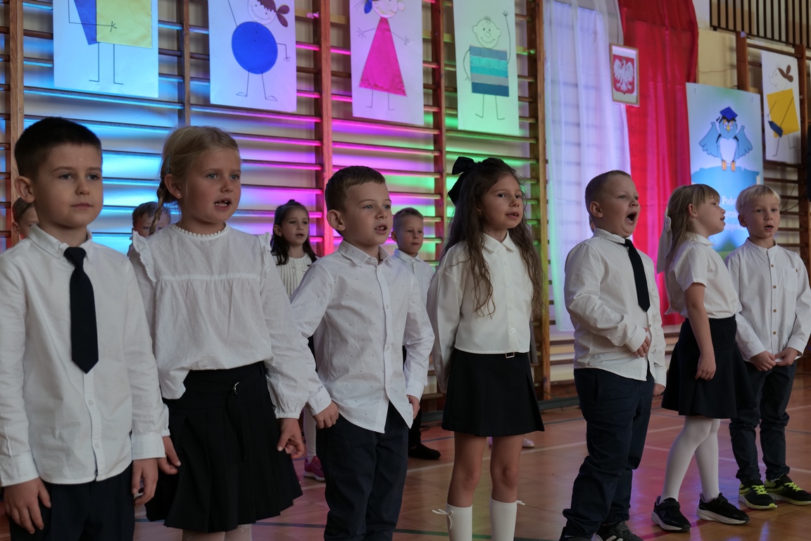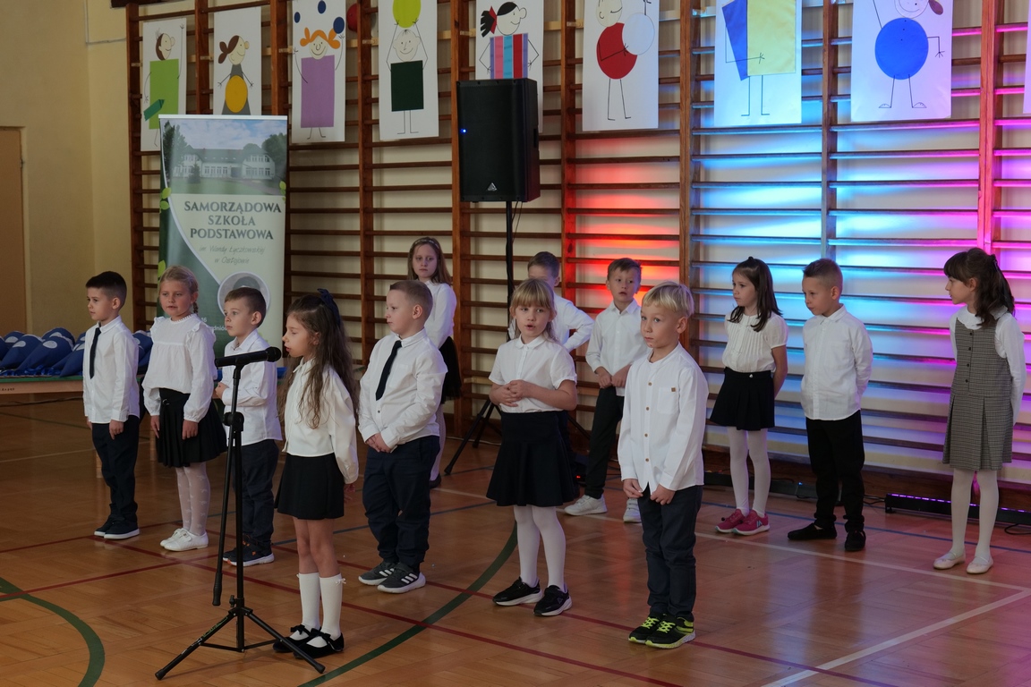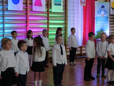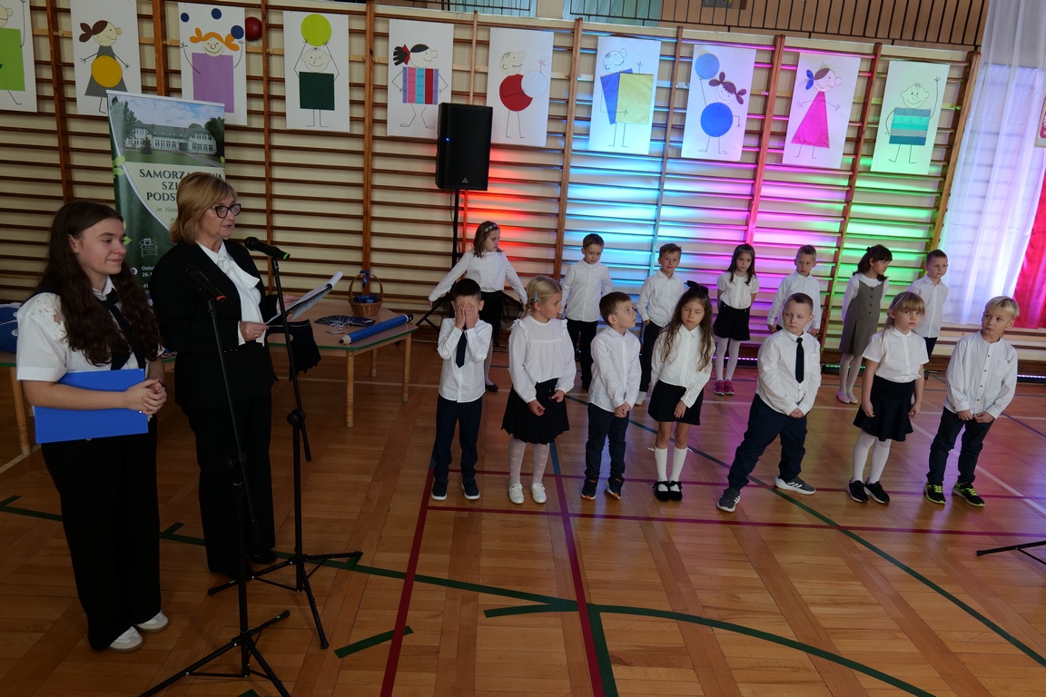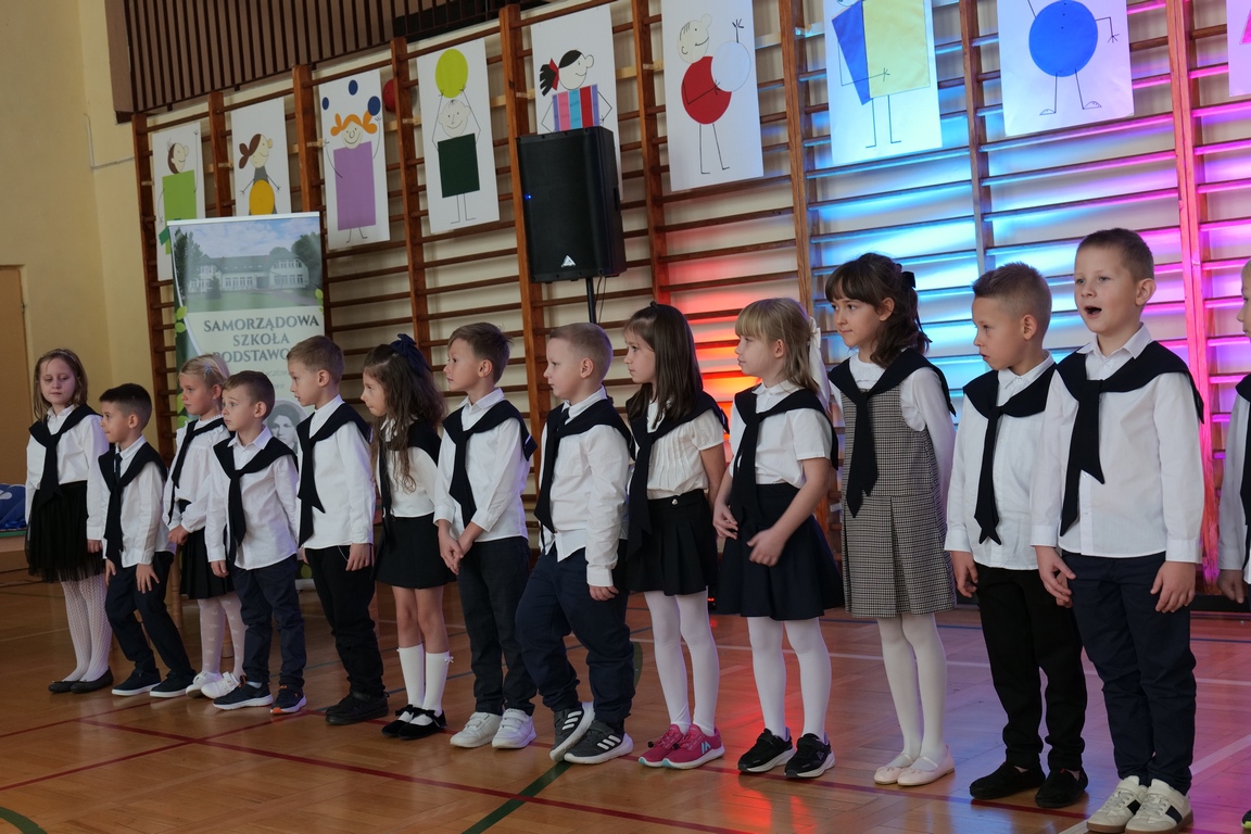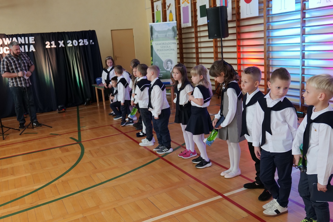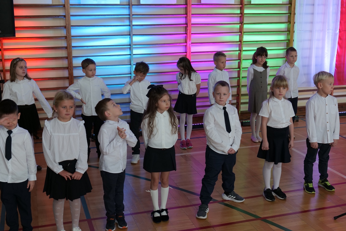 Następnie rozpoczęła się część artystyczna w wykonaniu pierwszoklasistów. Mali artyści, przygotowani przez wychowawczynię Agnieszkę Brzezińską, z wielkim zaangażowaniem śpiewali, recytowali i tańczyli, pokazując, że są już gotowi, by stać się pełnoprawnymi uczniami. Ich występ został nagrodzony gromkimi brawami. Całość uroczystości współprowadziła uczennica klasy VIII Zuzanna Połeć, przewodnicząca samorządu uczniowskiego..