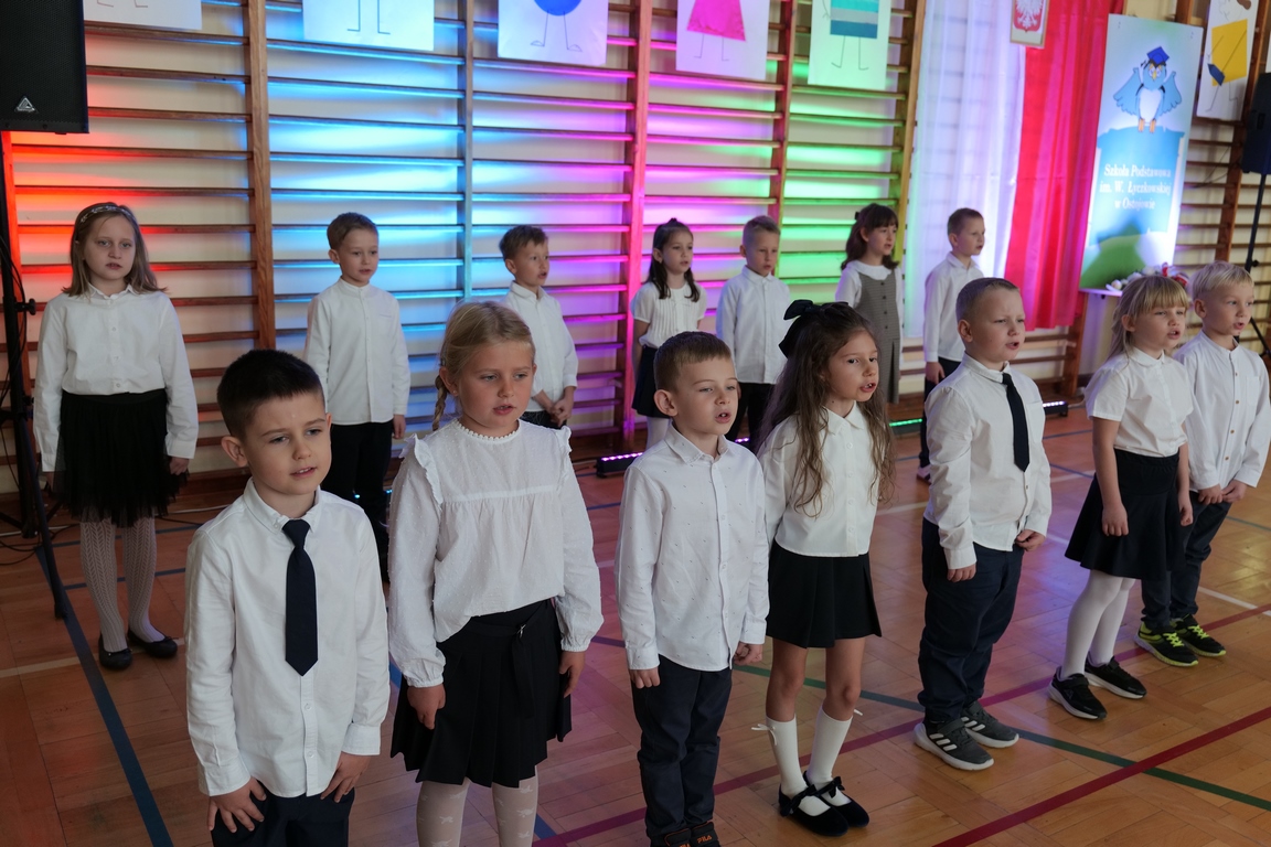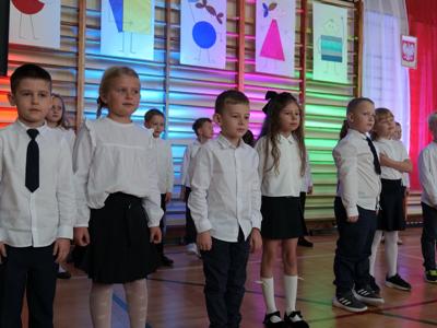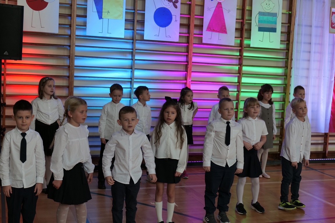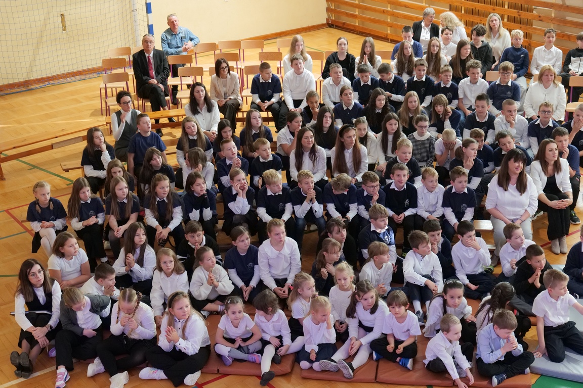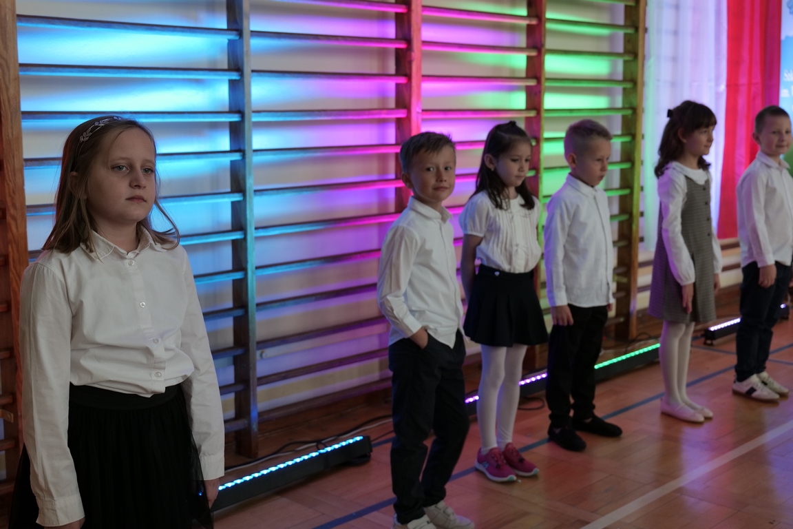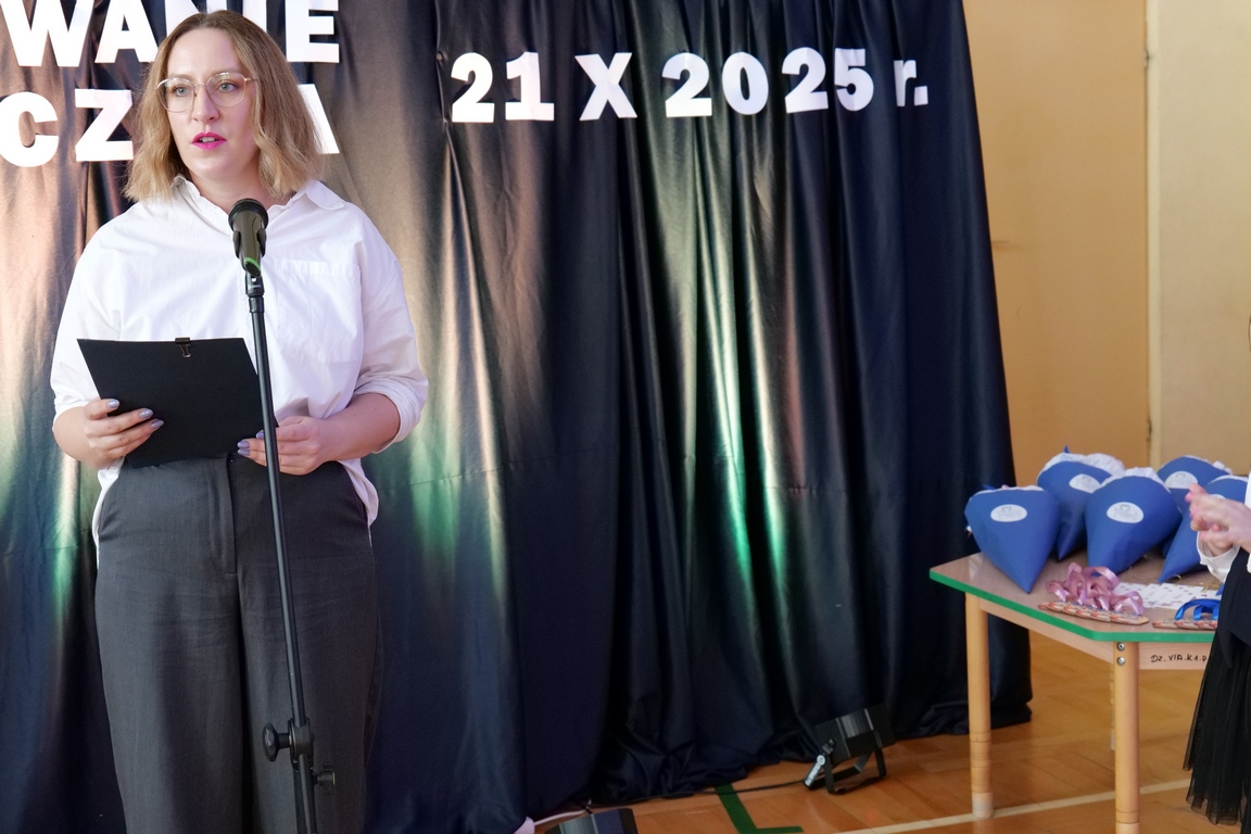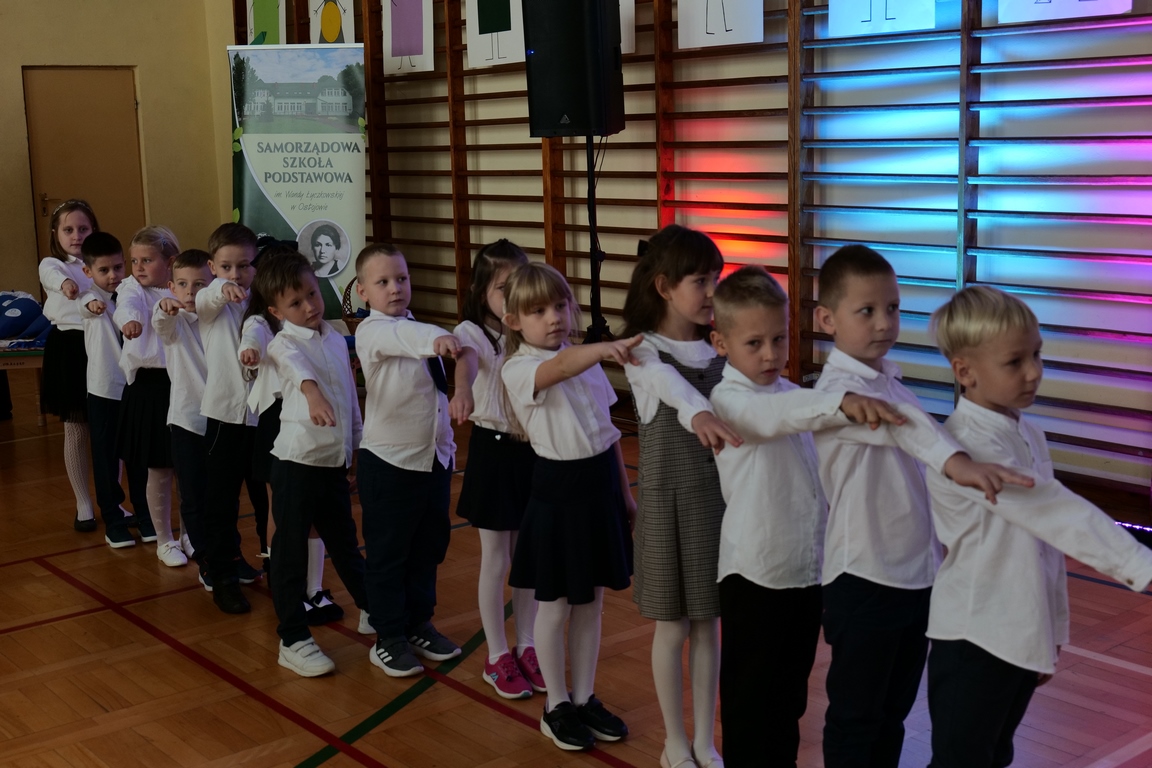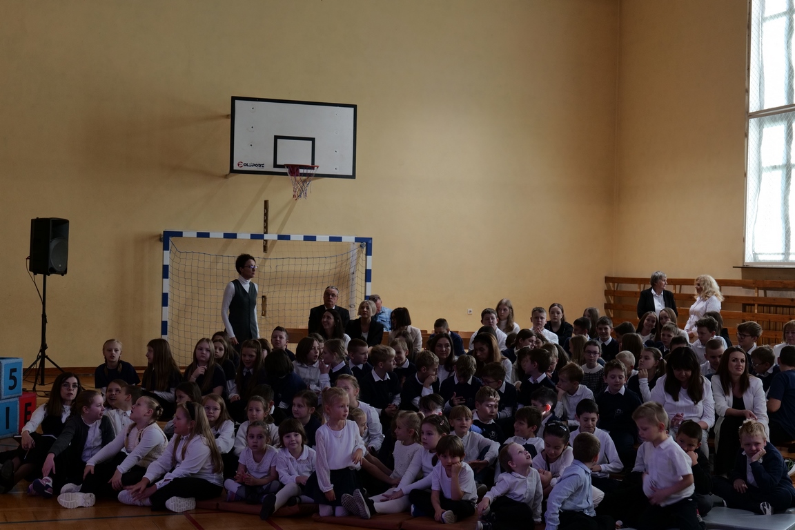 Następnie rozpoczęła się część artystyczna w wykonaniu pierwszoklasistów. Mali artyści, przygotowani przez wychowawczynię Agnieszkę Brzezińską, z wielkim zaangażowaniem śpiewali, recytowali i tańczyli, pokazując, że są już gotowi, by stać się pełnoprawnymi uczniami. Ich występ został nagrodzony gromkimi brawami. Całość uroczystości współprowadziła uczennica klasy VIII Zuzanna Połeć, przewodnicząca samorządu uczniowskiego..