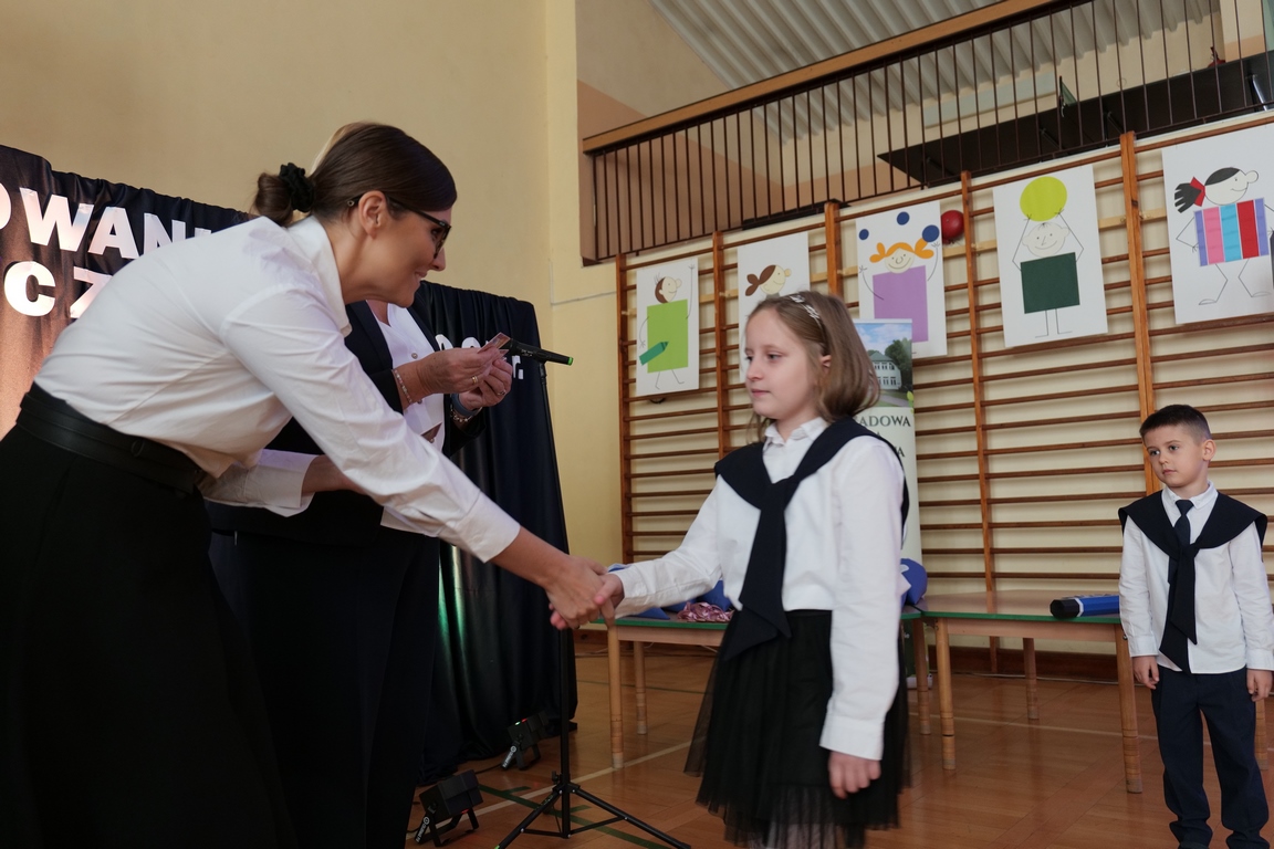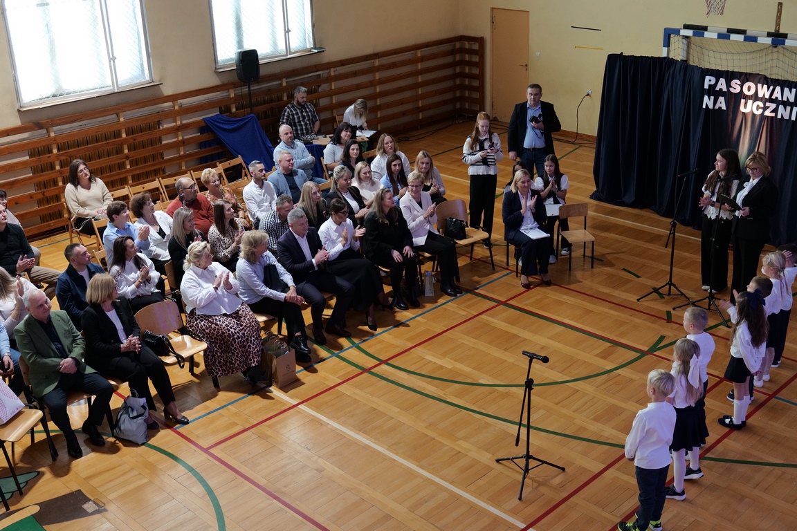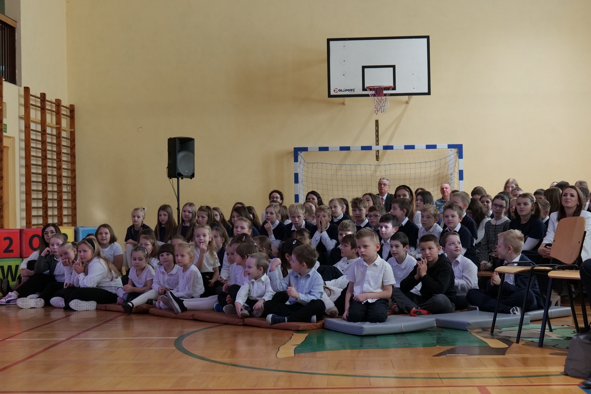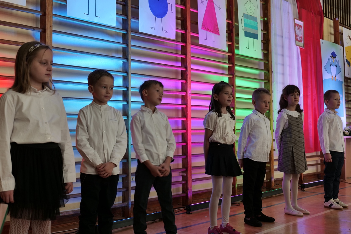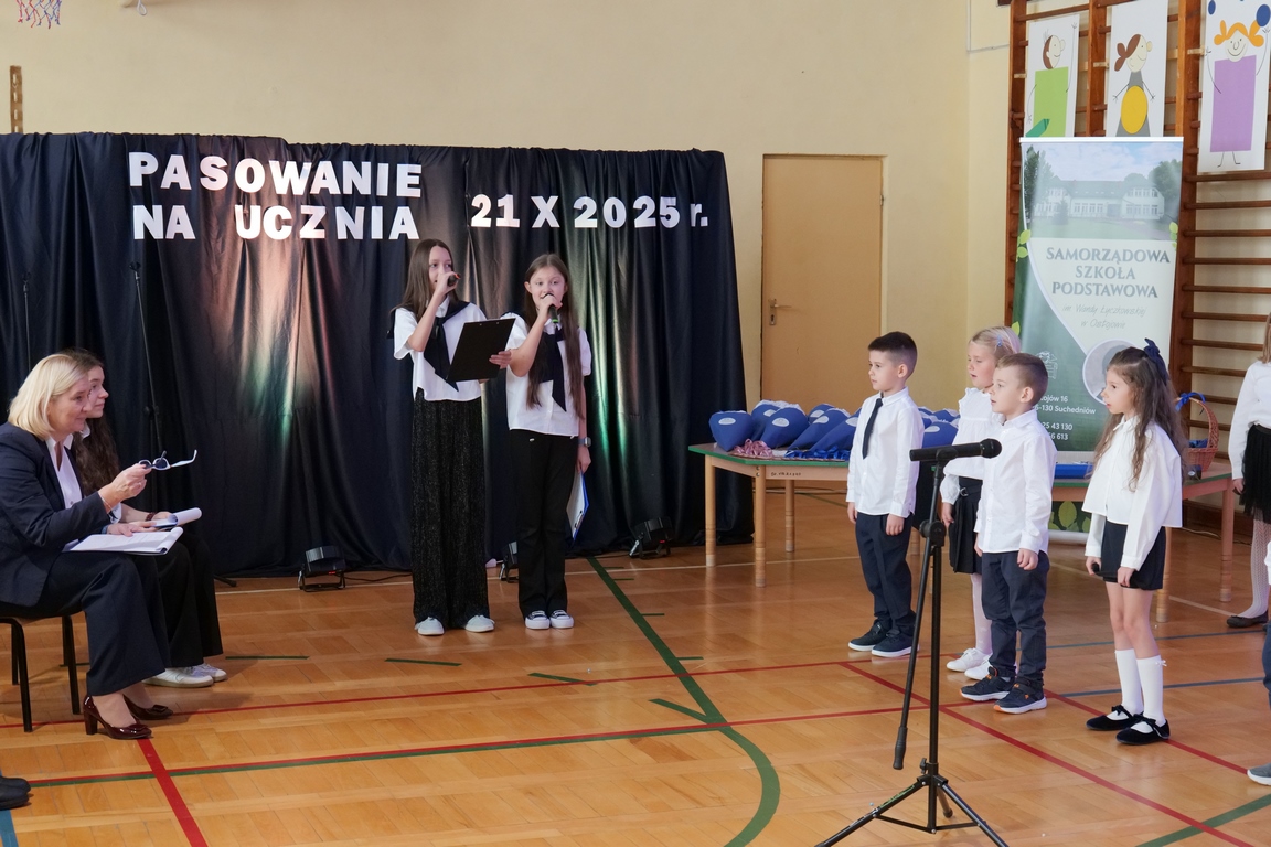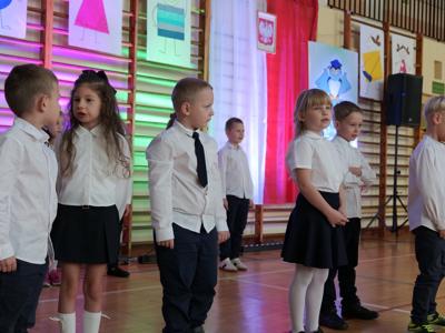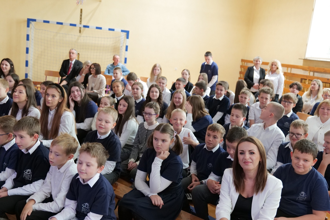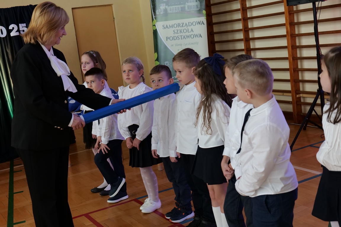 Następnie rozpoczęła się część artystyczna w wykonaniu pierwszoklasistów. Mali artyści, przygotowani przez wychowawczynię Agnieszkę Brzezińską, z wielkim zaangażowaniem śpiewali, recytowali i tańczyli, pokazując, że są już gotowi, by stać się pełnoprawnymi uczniami. Ich występ został nagrodzony gromkimi brawami. Całość uroczystości współprowadziła uczennica klasy VIII Zuzanna Połeć, przewodnicząca samorządu uczniowskiego..