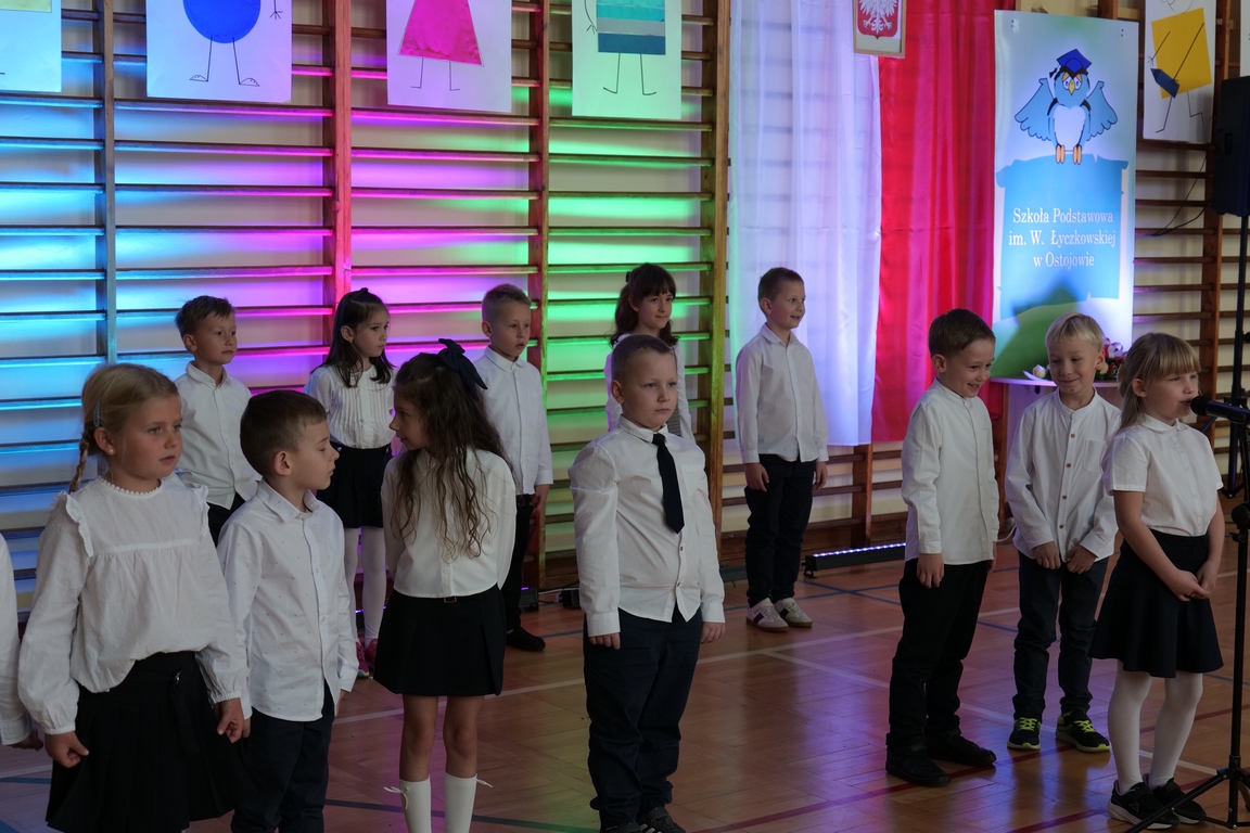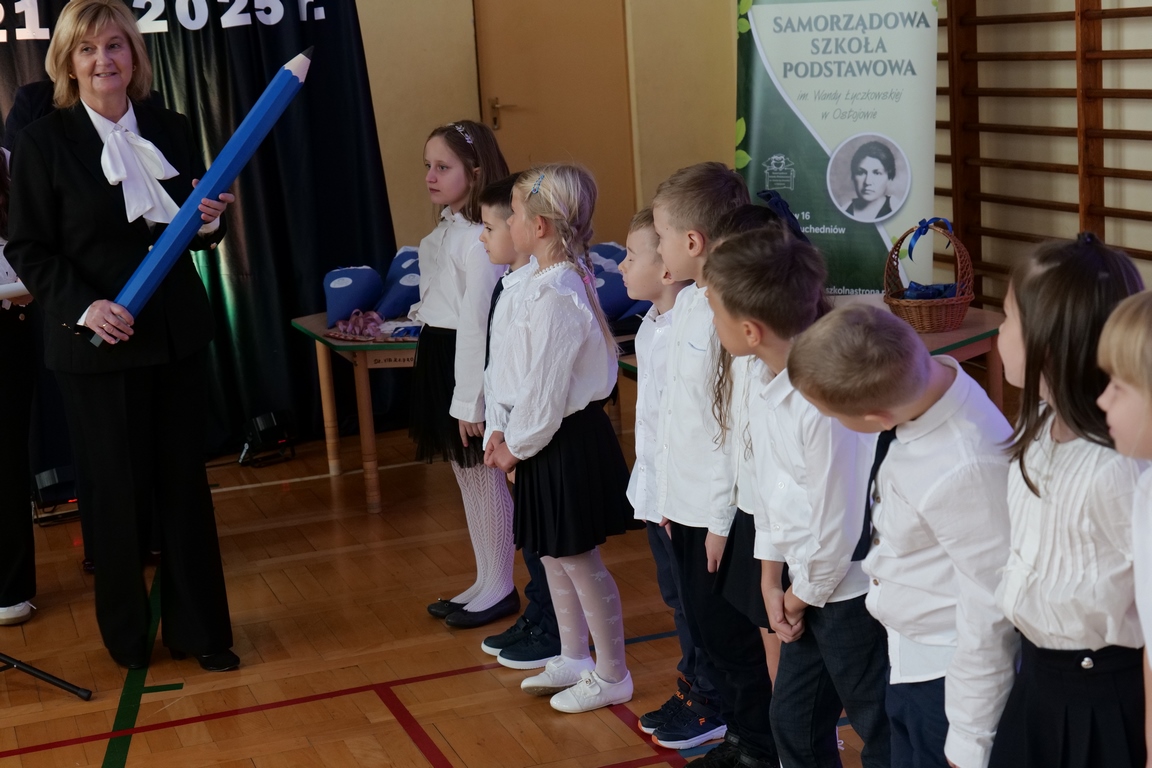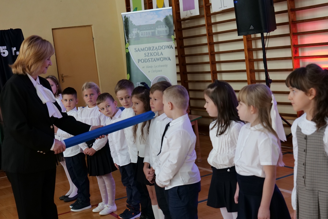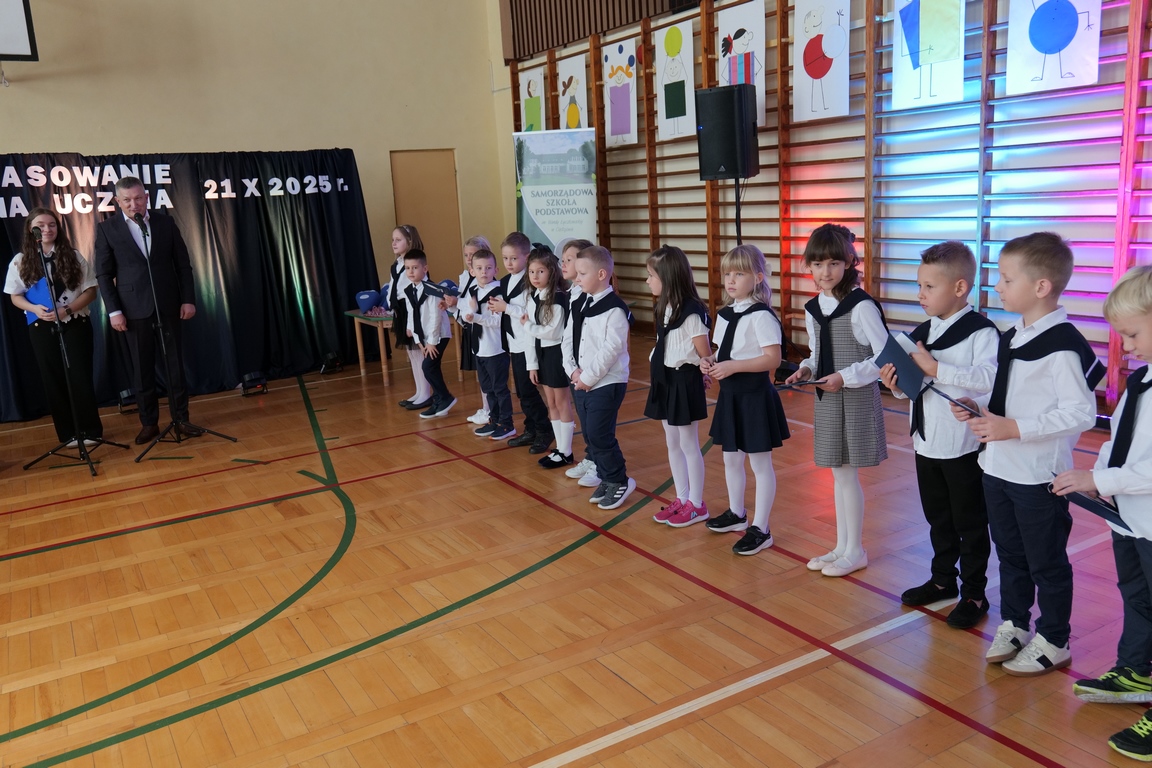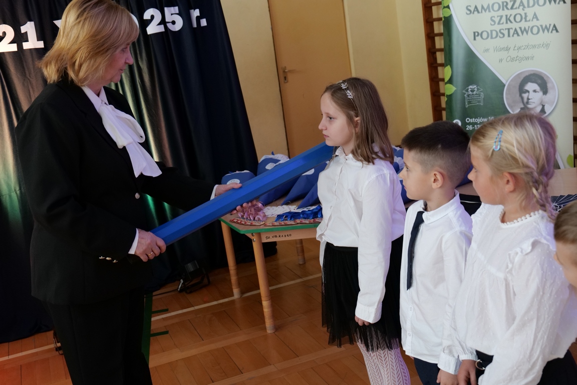 Kulminacyjnym momentem dnia było złożenie przez pierwszoklasistów uroczystego ślubowania na sztandar szkoły (w poczcie sztandarowym byli: Mirella Harenza, Wiktoria Nowak i Kacper Stępnik). Dzieci z powagą powtarzały słowa przysięgi, zobowiązując się do pilności w nauce, szacunku wobec nauczycieli i kolegów oraz dbania o dobre imię szkoły. Po ślubowaniu dyrektor dokonała aktu pasowania na ucznia, dotykając ramienia każdego dziecka symbolicznym ołówkiem i wypowiadając te najważniejsze słowa: „Pasuję cię na ucznia Samorządowej Szkoły Podstawowej w Ostojowie”. Od tego momentu pierwszoklasiści oficjalnie zostali włączeni w poczet uczniów naszej szkoły. Nowo pasowani uczniowie otrzymali kołnierze – element stroju galowego określony w statucie szkoły, a także legitymacje szkolne i pamiątkowe dyplomy, które będą przypominały im o tym wyjątkowym dniu.