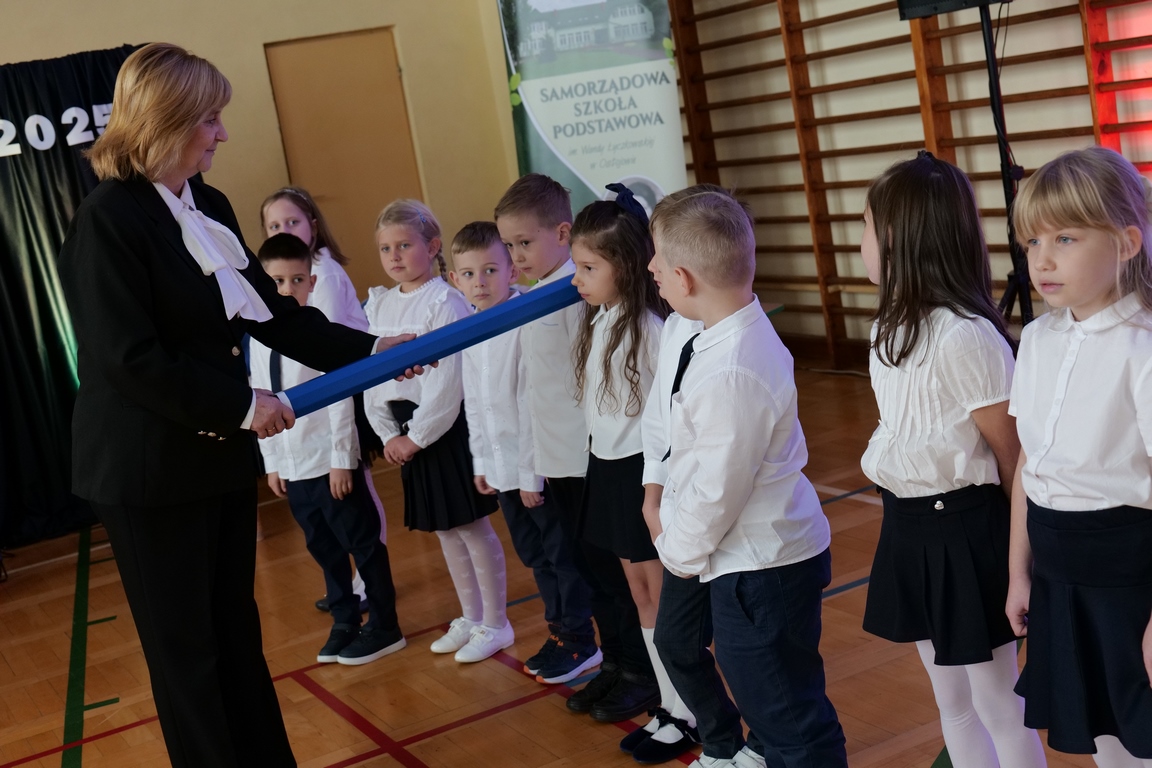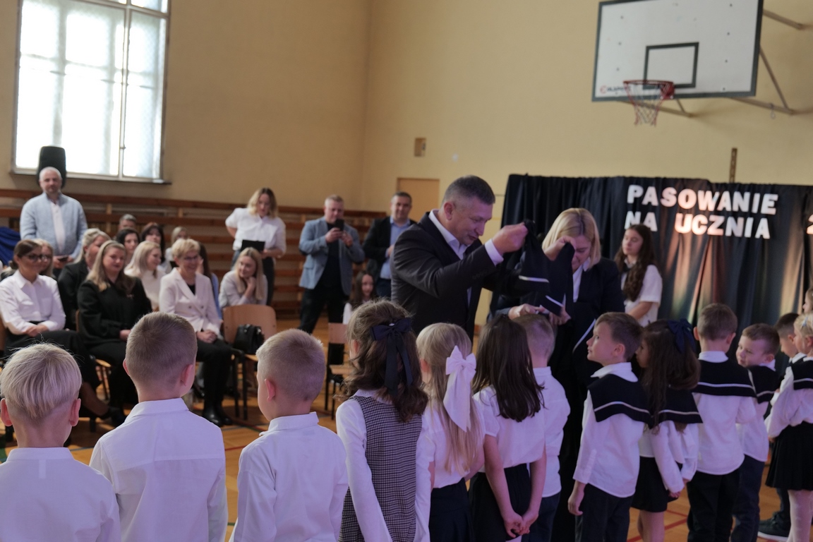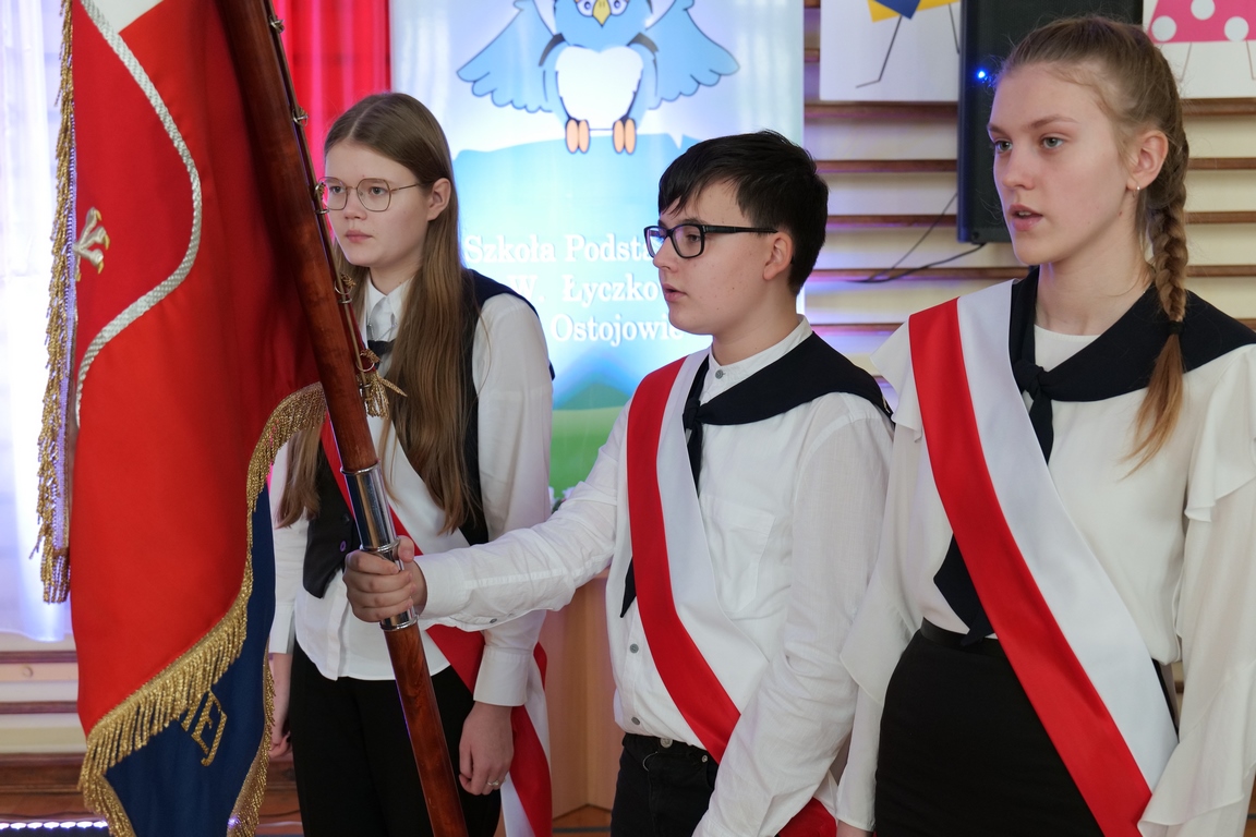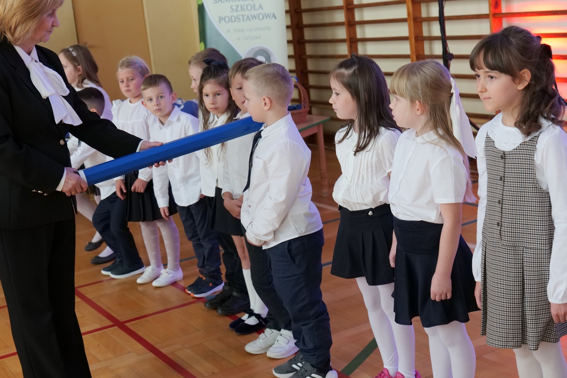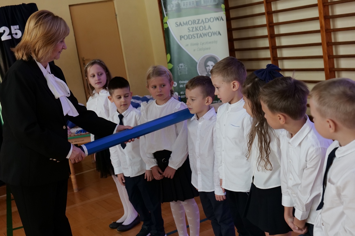 Kulminacyjnym momentem dnia było złożenie przez pierwszoklasistów uroczystego ślubowania na sztandar szkoły (w poczcie sztandarowym byli: Mirella Harenza, Wiktoria Nowak i Kacper Stępnik). Dzieci z powagą powtarzały słowa przysięgi, zobowiązując się do pilności w nauce, szacunku wobec nauczycieli i kolegów oraz dbania o dobre imię szkoły. Po ślubowaniu dyrektor dokonała aktu pasowania na ucznia, dotykając ramienia każdego dziecka symbolicznym ołówkiem i wypowiadając te najważniejsze słowa: „Pasuję cię na ucznia Samorządowej Szkoły Podstawowej w Ostojowie”. Od tego momentu pierwszoklasiści oficjalnie zostali włączeni w poczet uczniów naszej szkoły. Nowo pasowani uczniowie otrzymali kołnierze – element stroju galowego określony w statucie szkoły, a także legitymacje szkolne i pamiątkowe dyplomy, które będą przypominały im o tym wyjątkowym dniu.