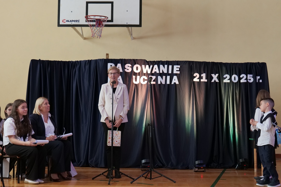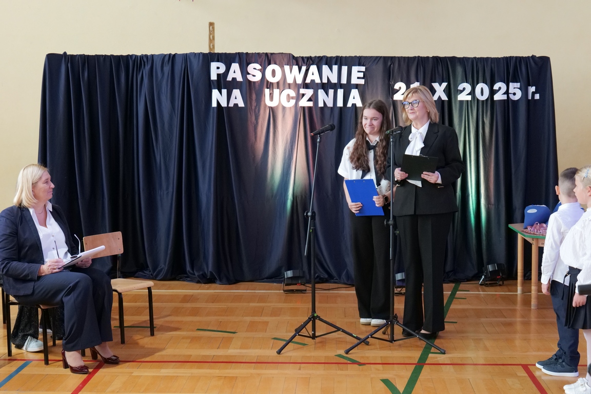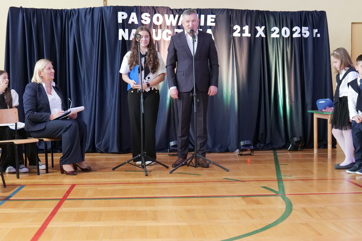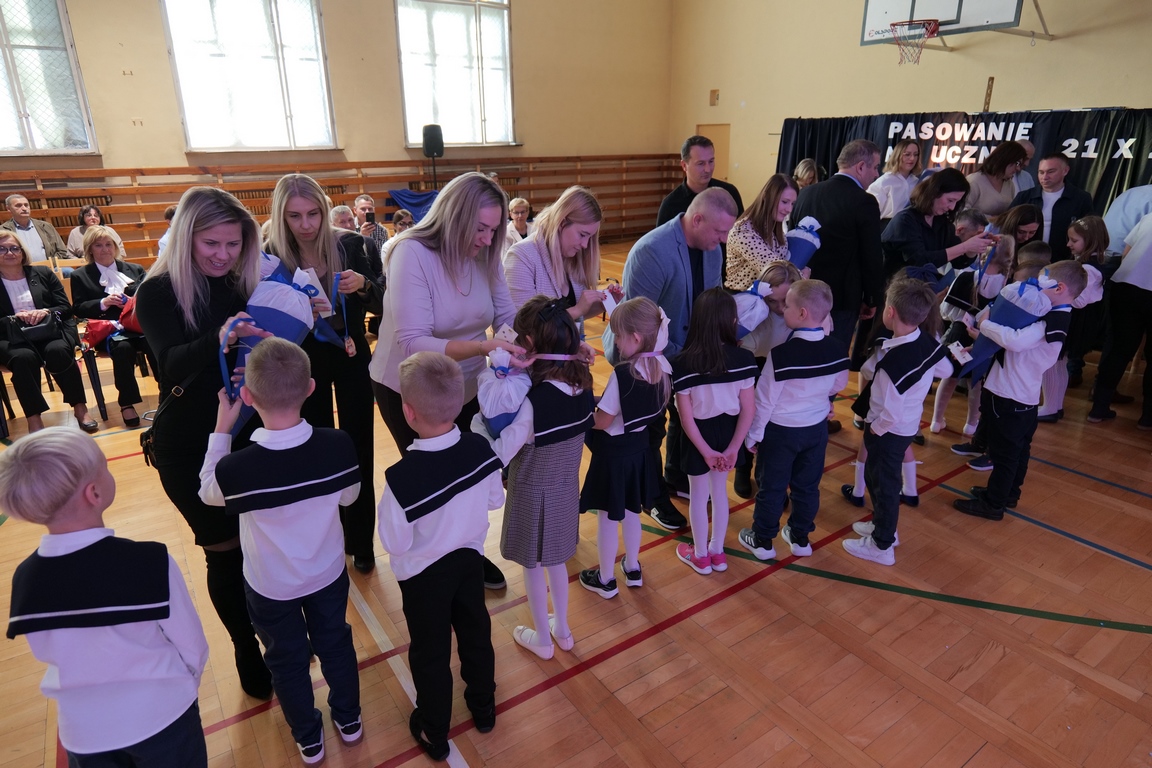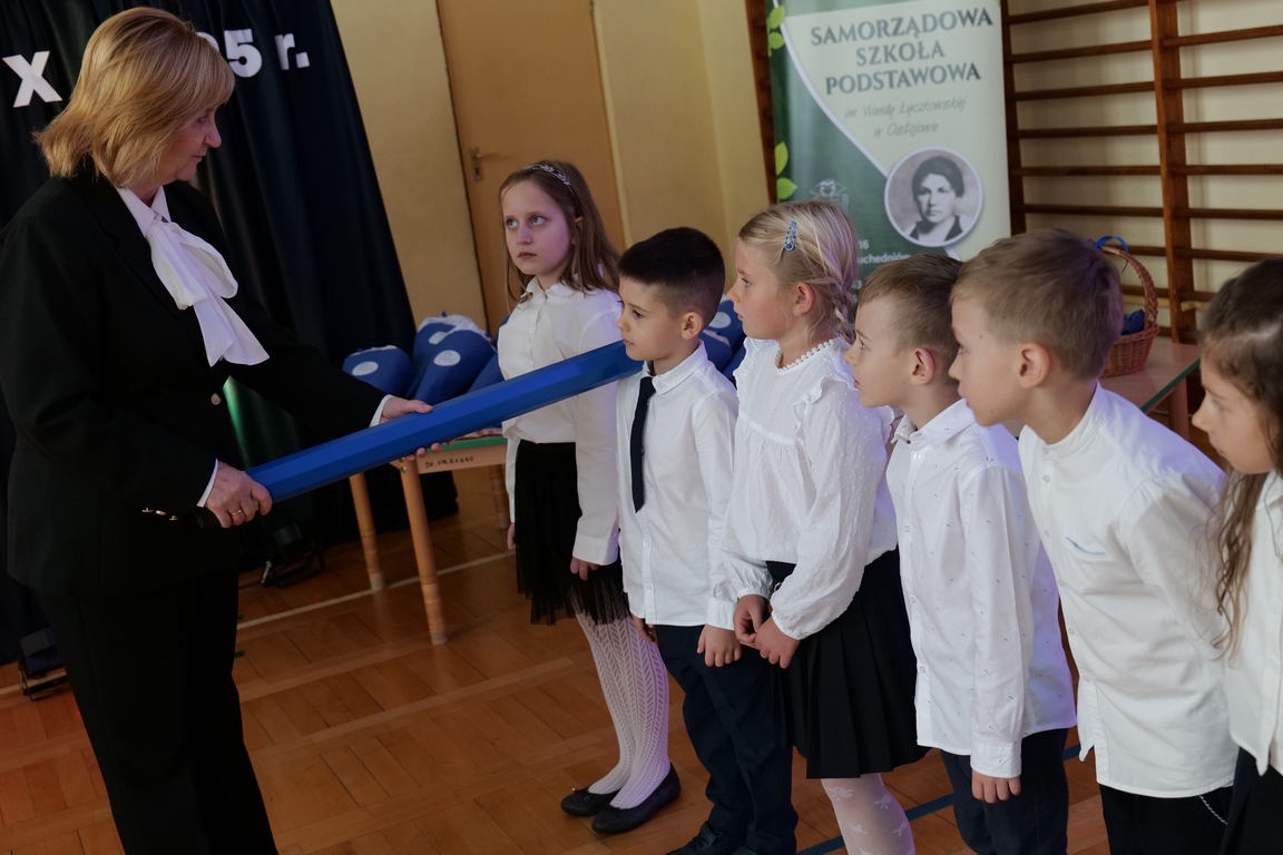 Kulminacyjnym momentem dnia było złożenie przez pierwszoklasistów uroczystego ślubowania na sztandar szkoły (w poczcie sztandarowym byli: Mirella Harenza, Wiktoria Nowak i Kacper Stępnik). Dzieci z powagą powtarzały słowa przysięgi, zobowiązując się do pilności w nauce, szacunku wobec nauczycieli i kolegów oraz dbania o dobre imię szkoły. Po ślubowaniu dyrektor dokonała aktu pasowania na ucznia, dotykając ramienia każdego dziecka symbolicznym ołówkiem i wypowiadając te najważniejsze słowa: „Pasuję cię na ucznia Samorządowej Szkoły Podstawowej w Ostojowie”. Od tego momentu pierwszoklasiści oficjalnie zostali włączeni w poczet uczniów naszej szkoły. Nowo pasowani uczniowie otrzymali kołnierze – element stroju galowego określony w statucie szkoły, a także legitymacje szkolne i pamiątkowe dyplomy, które będą przypominały im o tym wyjątkowym dniu.