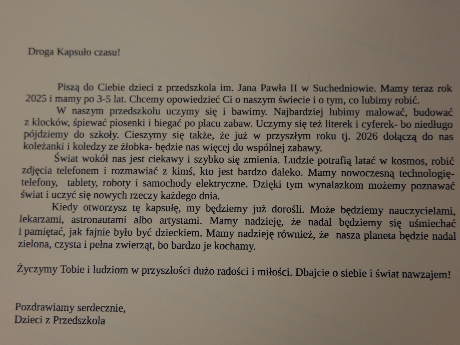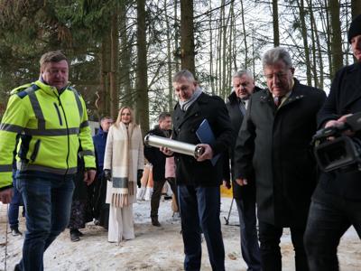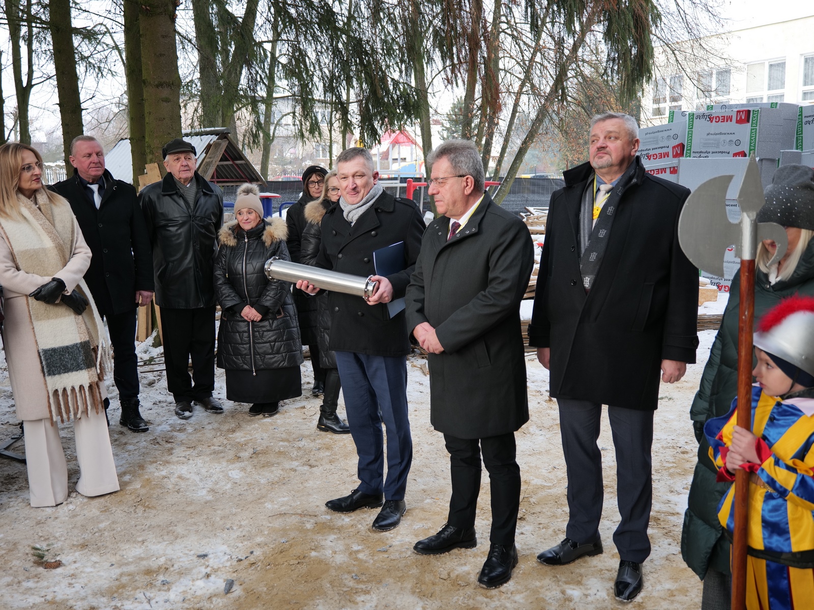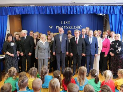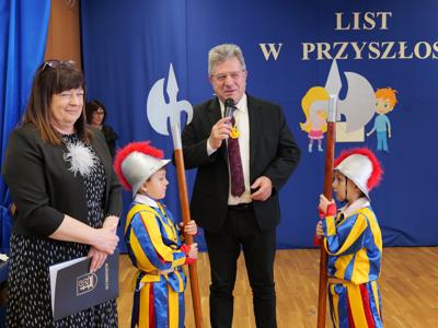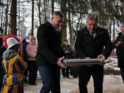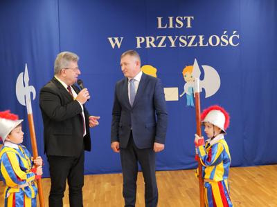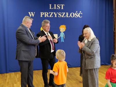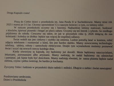 Następnie burmistrz Dariusz Miernik odczytał list do Mieszkańców Przyszłości i Przyszłego Burmistrza, w którym czytamy m.in.: „Z okazji budowy pierwszego publicznego żłobka na terenie Gminy Suchedniów składamy ten list w kapsule czasu – z ogromnym entuzjazmem, ale i z poczuciem dumy oraz odpowiedzialności. Niech stanie się on dla Was świadectwem naszych wartości, marzeń i zaangażowania w rozwój lokalnej wspólnoty. Pragniemy, aby był także zapisem tego, jak funkcjonował samorząd w roku 2026 i jakie idee mu przyświecały…. Z myślą o najmłodszych mieszkańcach naszej Gminy oraz o ich rodzicach - o bezpiecznym rozwoju, radosnym odkrywaniu świata i wsparciu rodzin – podjęliśmy decyzję o budowie żłobka. Dziś stoimy nad fundamentami budynku, który jest dla nas symbolem troski o rodzinę i wspólnotę, a przede wszystkim o Was – o przyszłe pokolenia Suchedniowian. Nie podejmujemy decyzji na chwilę. Towarzyszy nam głębokie poczucie odpowiedzialności za to, jak będzie wyglądało życie tych, którzy przyjdą po nas…. Do Ciebie, Przyszły Burmistrzu – być może wychowanku tego żłobka – kieruję szczególne życzenia. Prowadź Gminę mądrze i odpowiedzialnie. Niech każda Twoja decyzja wynika z troski o dobro mieszkańców, a jej miarą niech zawsze będzie drugi człowiek. Dbaj o rozwój tej placówki, o dzieci, ich rodziców oraz pracowników. Pielęgnuj wartości, na których opiera się silna wspólnota: równość, otwartość i wzajemny szacunek”.